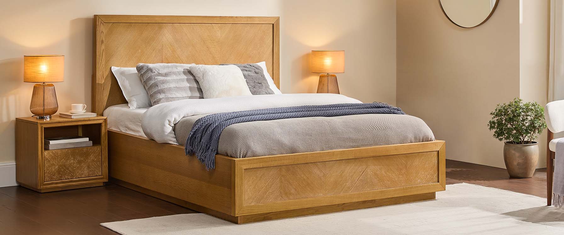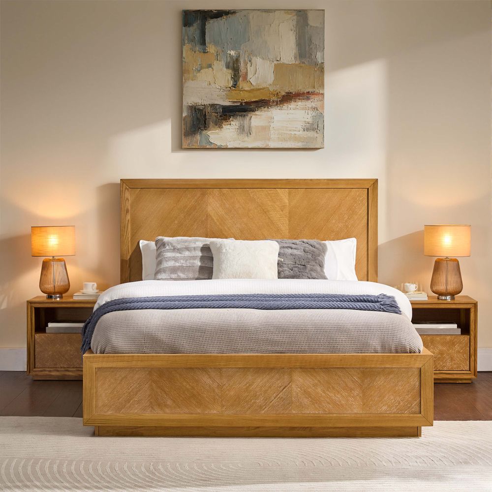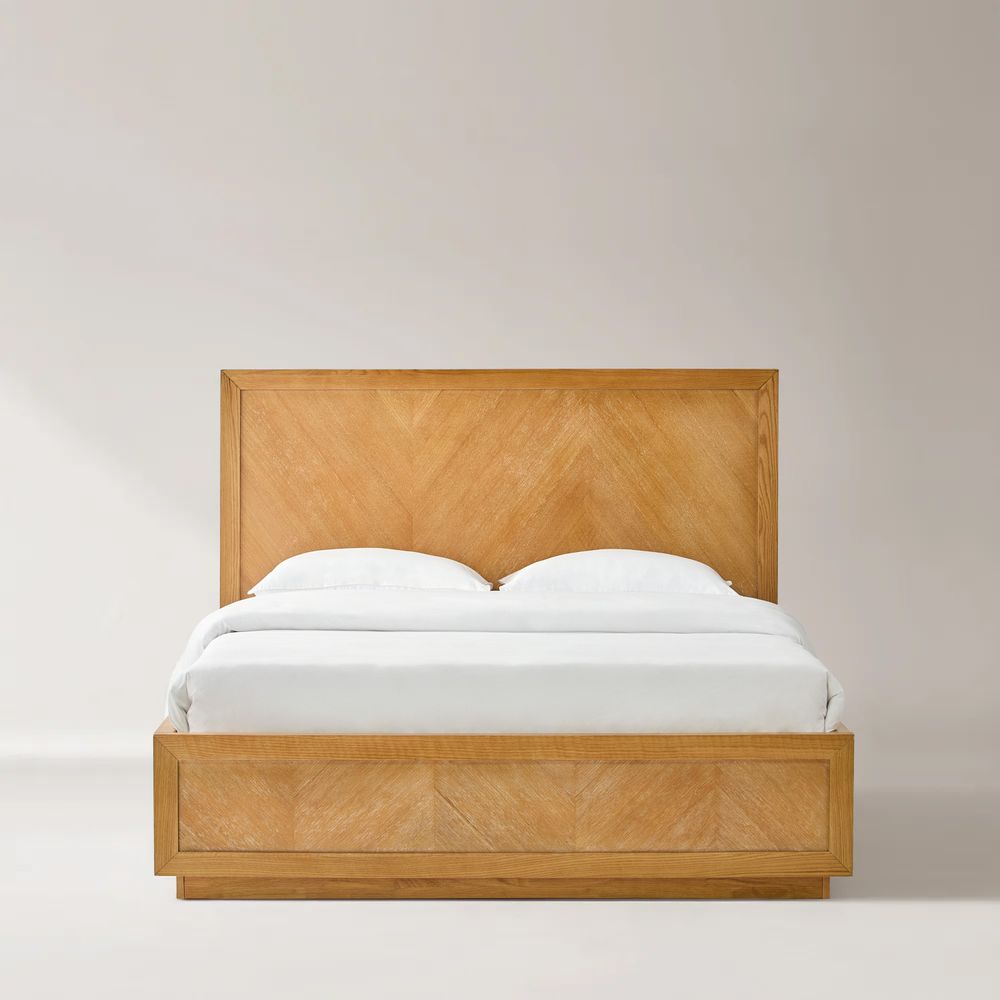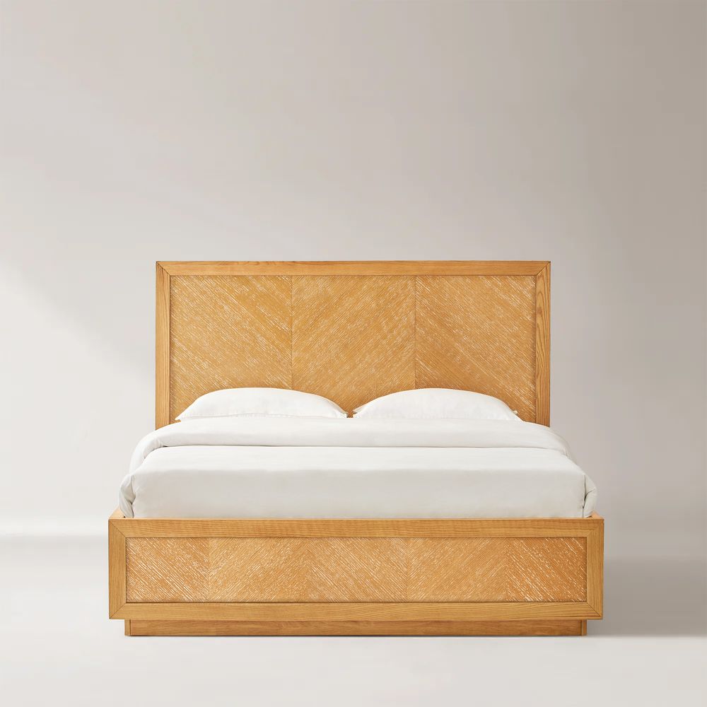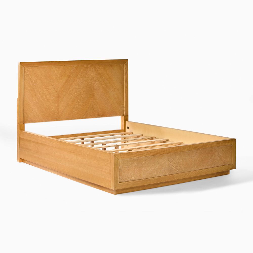 Crafted of American solid oak and engineered wood with oak veneers.All wood is kiln-dried for added durability.Finish is achieved through multistep process in which wood is wire brushed to highlight its rich grain.Wood glazing adds visual interest with greater depth and layering and enhances coloring.Create a worn, vintage look with a subtle dusty wash.Include 6 middle support legs.Bed accommodates most standard mattresses, box spring optional, supporting up to 800 lbs.Color perception may vary due to wood characteristics, lighting, and devices. Wood grain variation is expected, as each is unique.