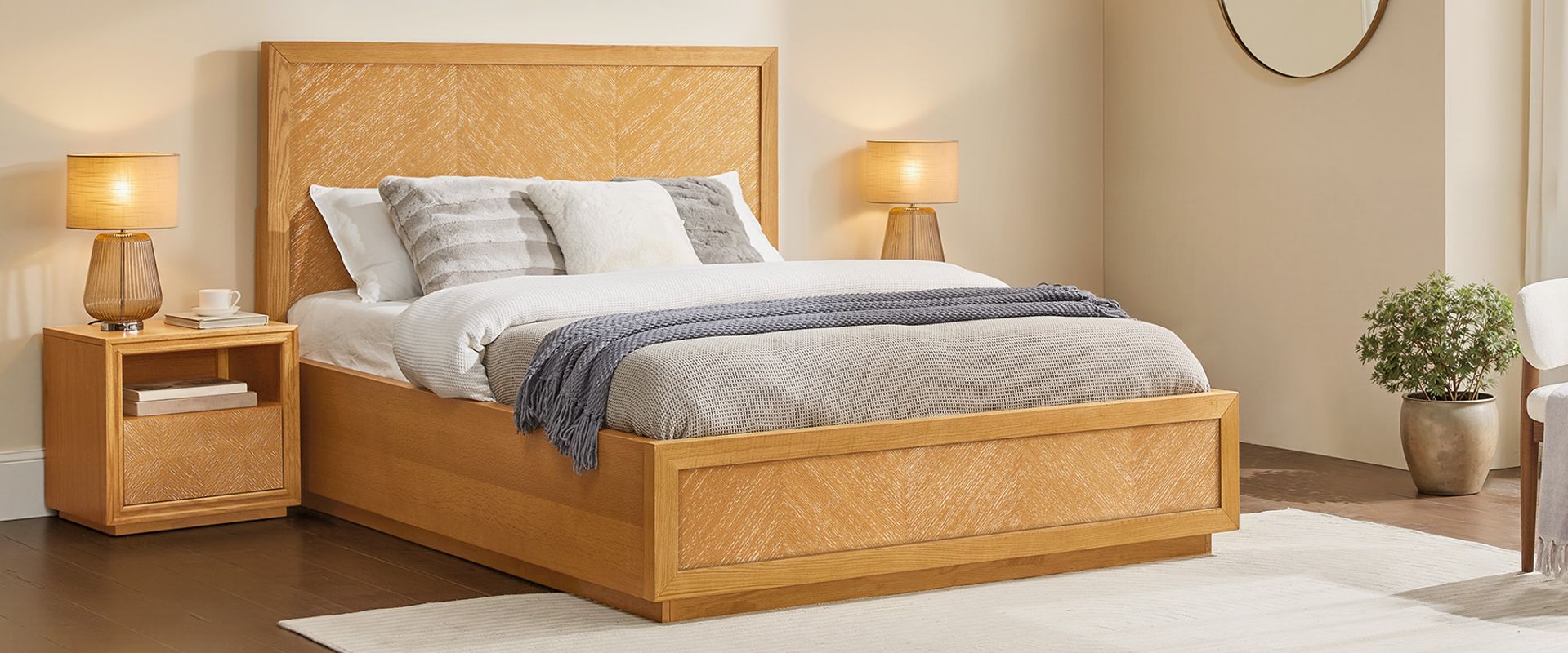 Crafted of American solid oak and engineered wood with oak veneers.All wood is kiln-dried for added durability.Finish is achieved through multistep process in which wood is wire brushed to highlight its rich grain.Wood glazing adds visual interest with greater depth and layering and enhances coloring.Create a worn, vintage look with a subtle dusty wash.Include 6 middle support legs.Bed accommodates most standard mattresses, box spring required, supporting up to 800 lbs.Color perception may vary due to wood characteristics, lighting, and devices. Wood grain variation is expected, as each is unique.