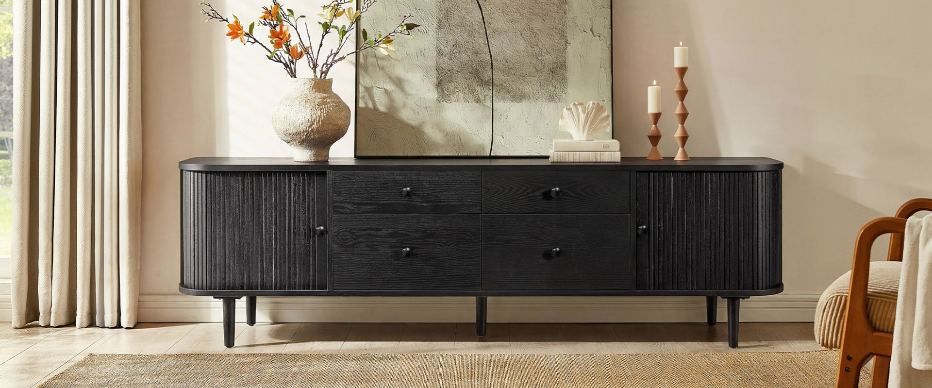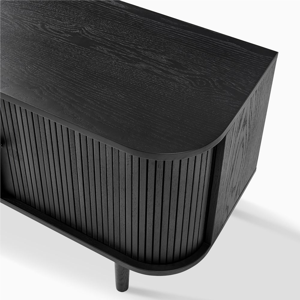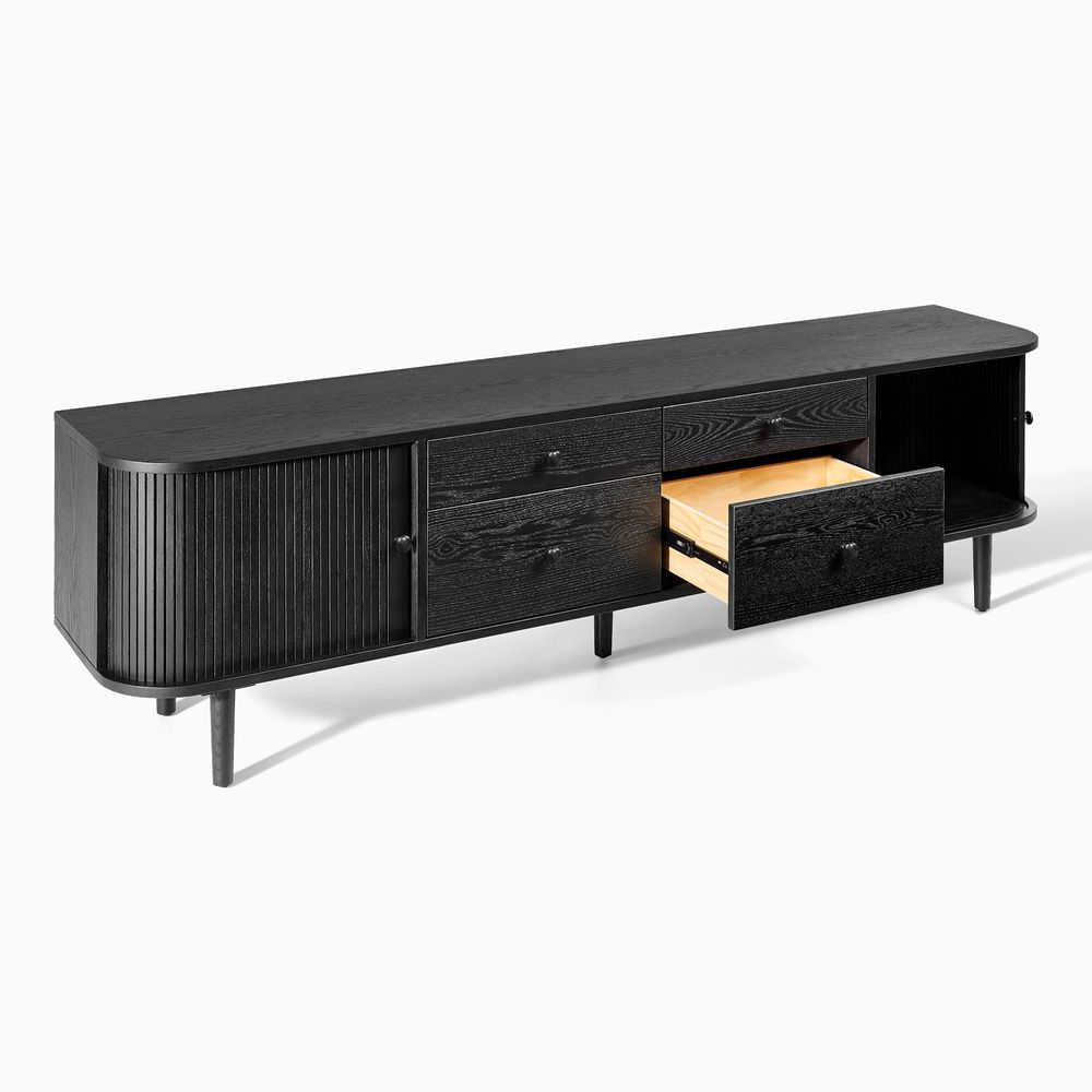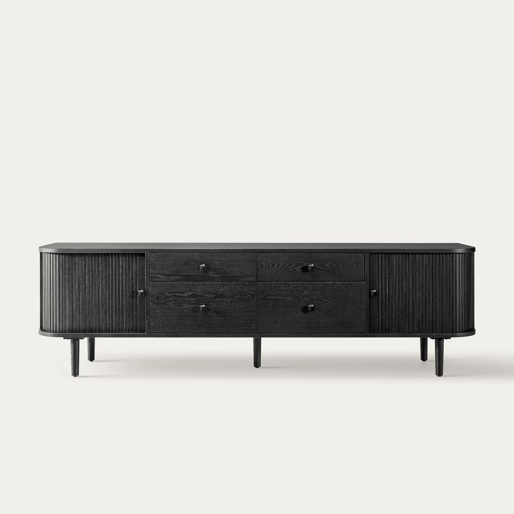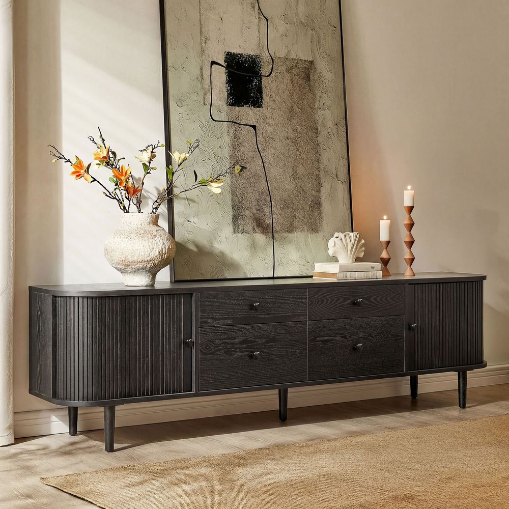 Tristan media console crafted from solid oak and plywood with oak veneer, this console exudes organic curves and understated elegance. The drawers and side tambour doors offer generous storage, ensuring effortless tidiness. Fluted cabinet doors, softly rounded edges, and tapered legs evoke a nostalgic yet modern warmth.