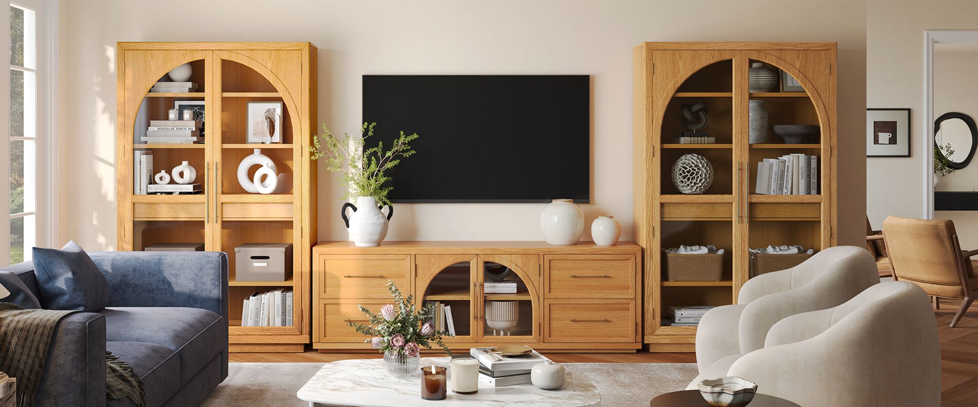 Reflecting the majestic arches of medieval castles, this Valborg collection combines elegance and practicality. Its wooden structure and arched accents capture the fortress-like resilience, perfect for storing collection with a touch of history.