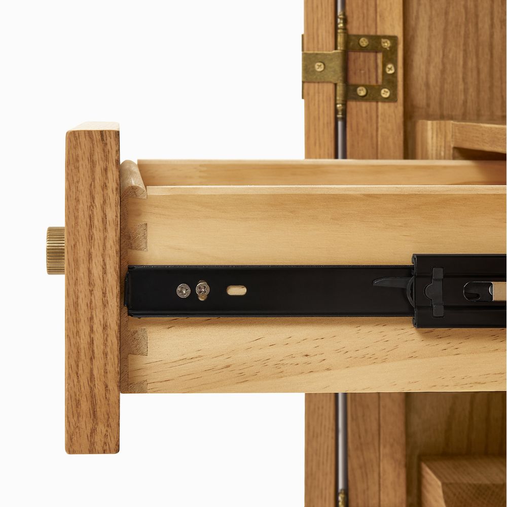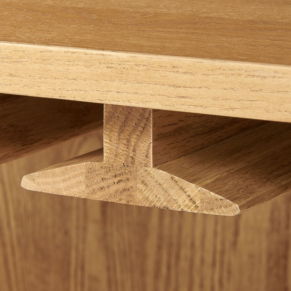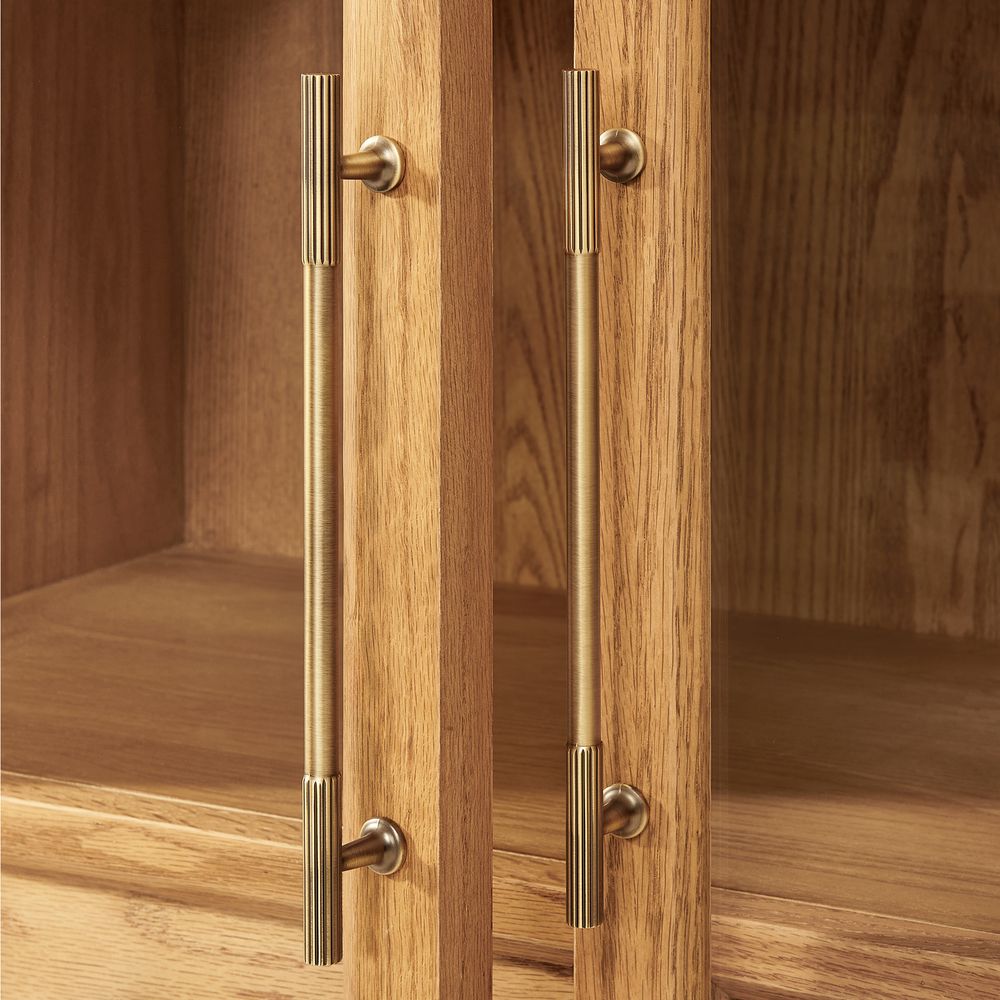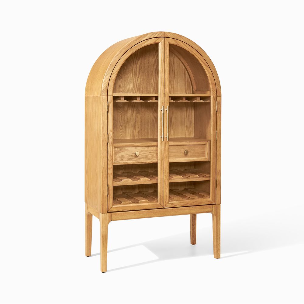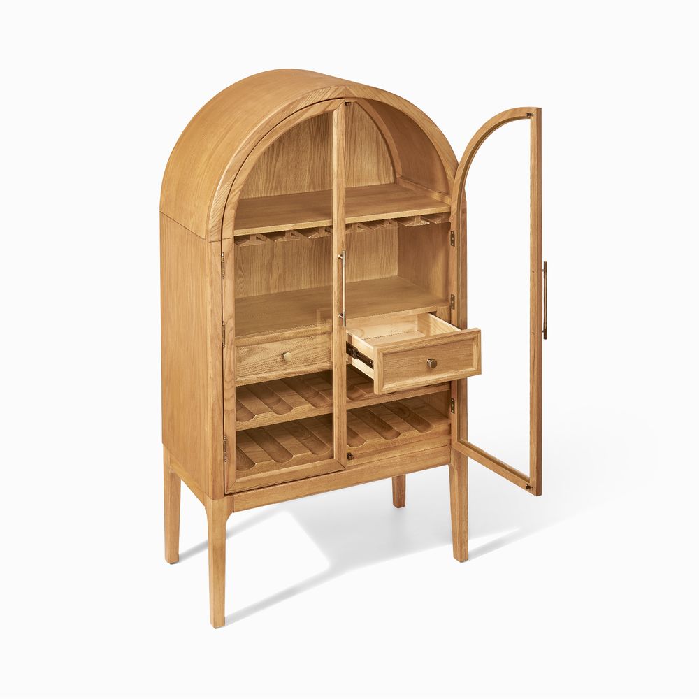 Crafted of American solid oak and engineered wood with oak veneers.All wood is kiln-dried for added durability.Finish is achieved through multistep process in which wood is wire brushed to highlight its rich grain.Wood glazing adds visual interest with greater depth and layering and enhances coloring.Solid wood blocks are used at structural joints for reinforcement.Drawers are crafted with precision dovetail joints for superior sturdiness and weight-bearing strength.Built-in wine racks hold 12 bottles.Built-in wine glass racks hold 14 standard sized glasses.Color perception may vary due to wood characteristics, lighting, and devices. Wood grain variation is expected, as each is unique.