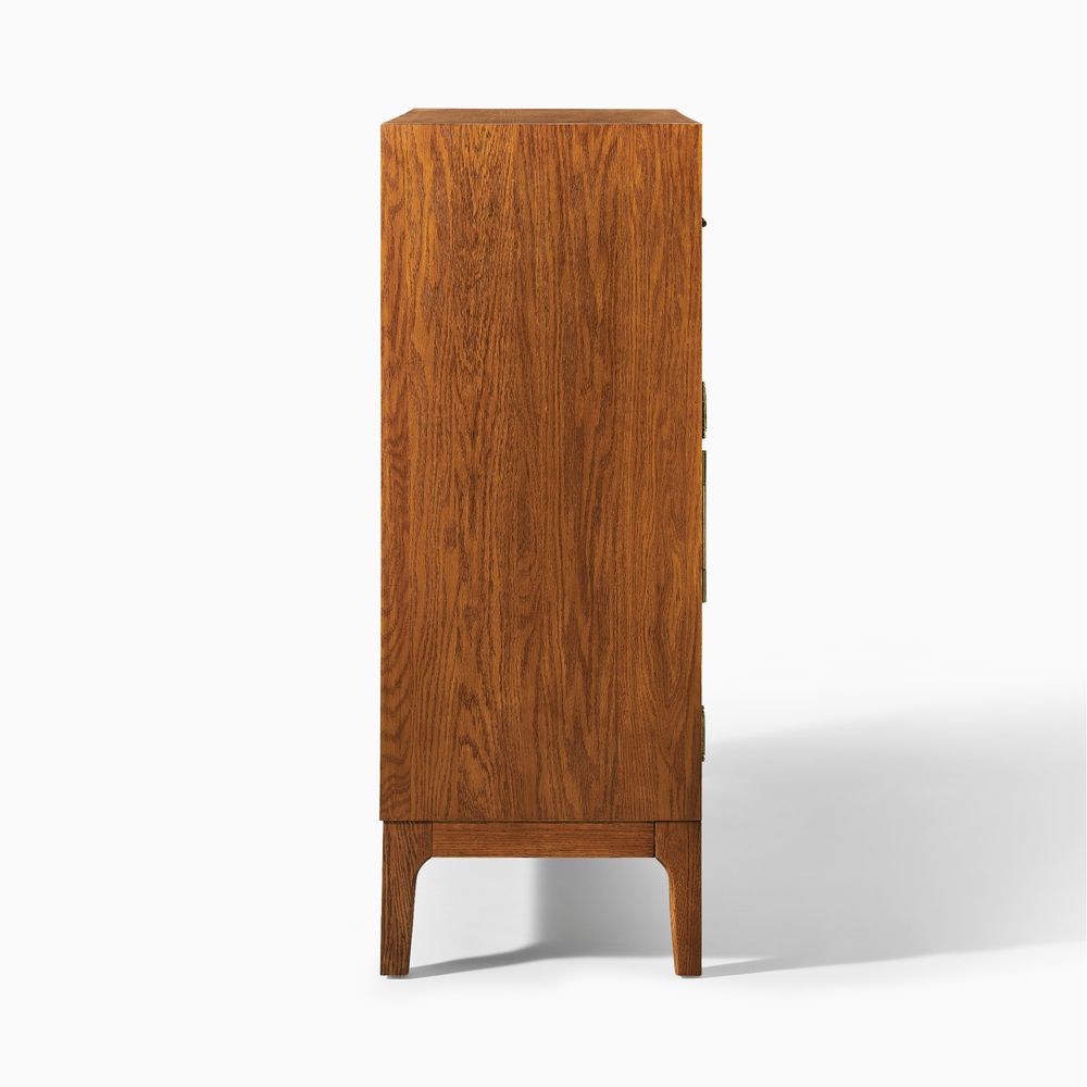Crafted of American solid oak and engineered wood with oak veneers.All wood is kiln-dried for added durability.Finish is achieved through multistep process in which wood is wire brushed to highlight its rich grain.Wood glazing adds visual interest with greater depth and layering and enhances coloring.Solid wood blocks are used at structural joints for reinforcement.Natural rattan is stained, hand-sanded and finished with a topcoat.Back of cabinet and cabinet interior are fully finished.Built-in wine racks hold 12 bottles.Built-in wine glass racks hold 16 standard sized glasses.Color perception may vary due to wood characteristics, lighting, and devices. Wood grain variation is expected, as each is unique.