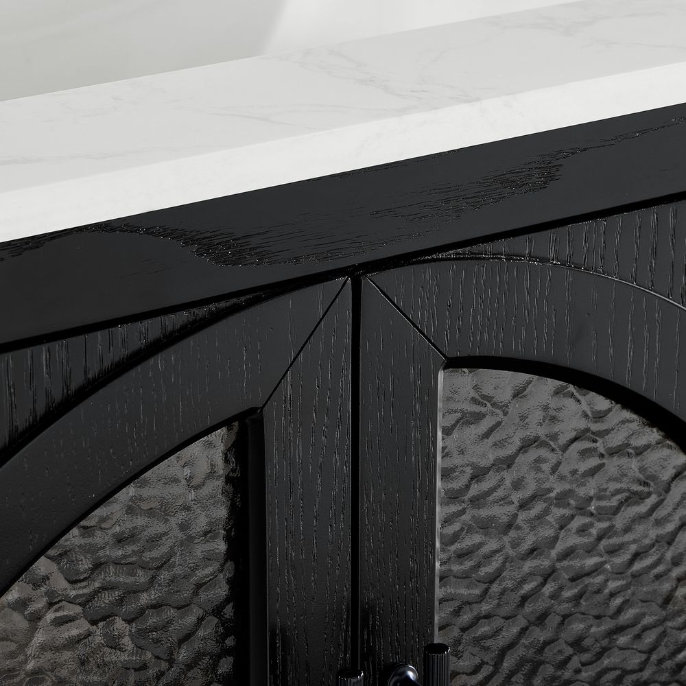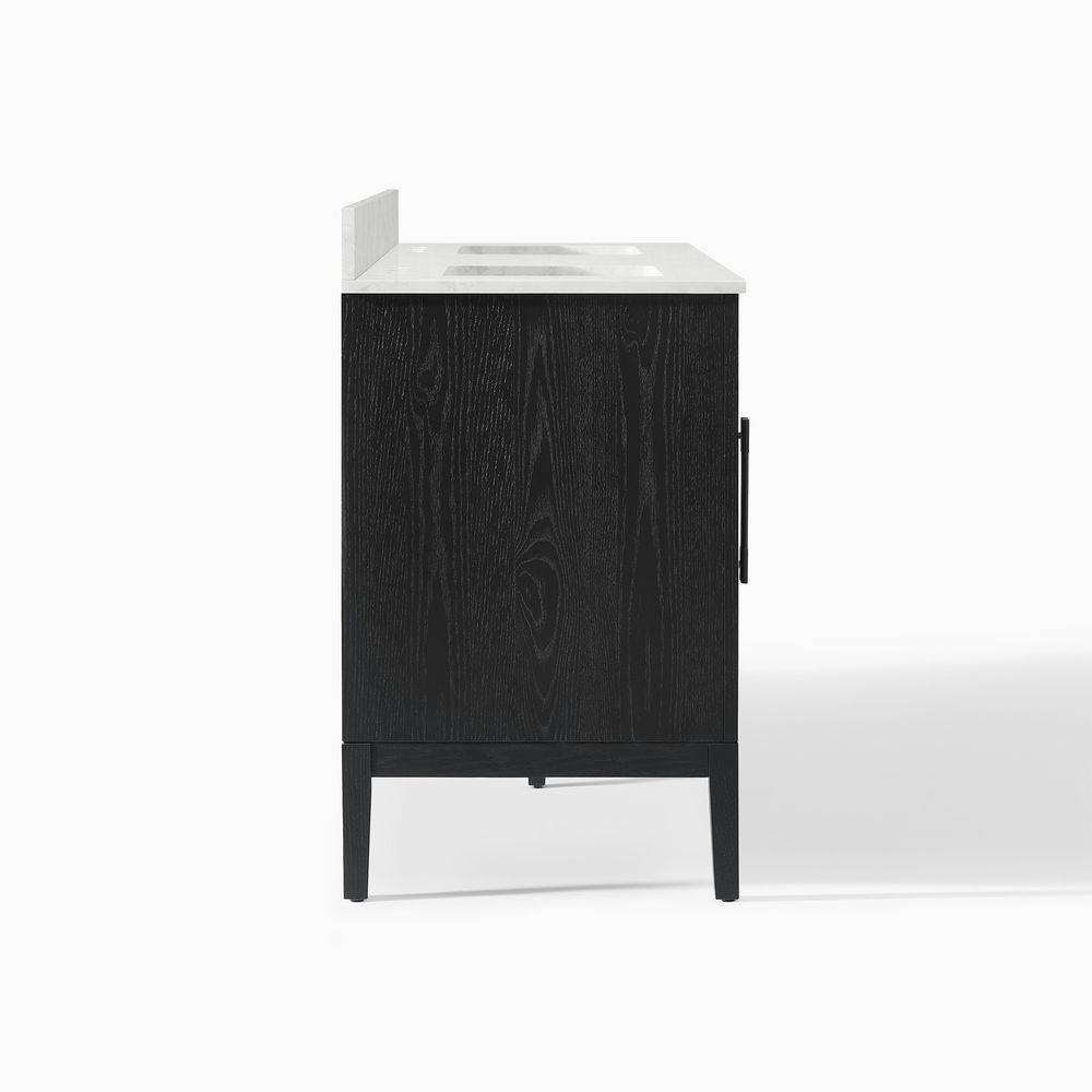 Crafted of cultured marble, solid wood, and plywood with American oak veneers.Countertop and backsplash are honed and sealed for a satin finish with deep veining and natural color contrasts.Finish is achieved through multistep process in which wood is wire brushed to highlight its rich grain.Wood glazing adds visual interest with greater depth and layering and enhances coloring.All wood is kiln-dried for added durability.Drawers are crafted with precision dovetail joints for superior sturdiness and weight-bearing strength.Solid wood blocks are used at structural joints for reinforcement.Color perception may vary due to wood characteristics, lighting, and devices. Wood grain variation is expected, as each is unique.Variation in the veining of stone is to be expected, as each piece will be unique.