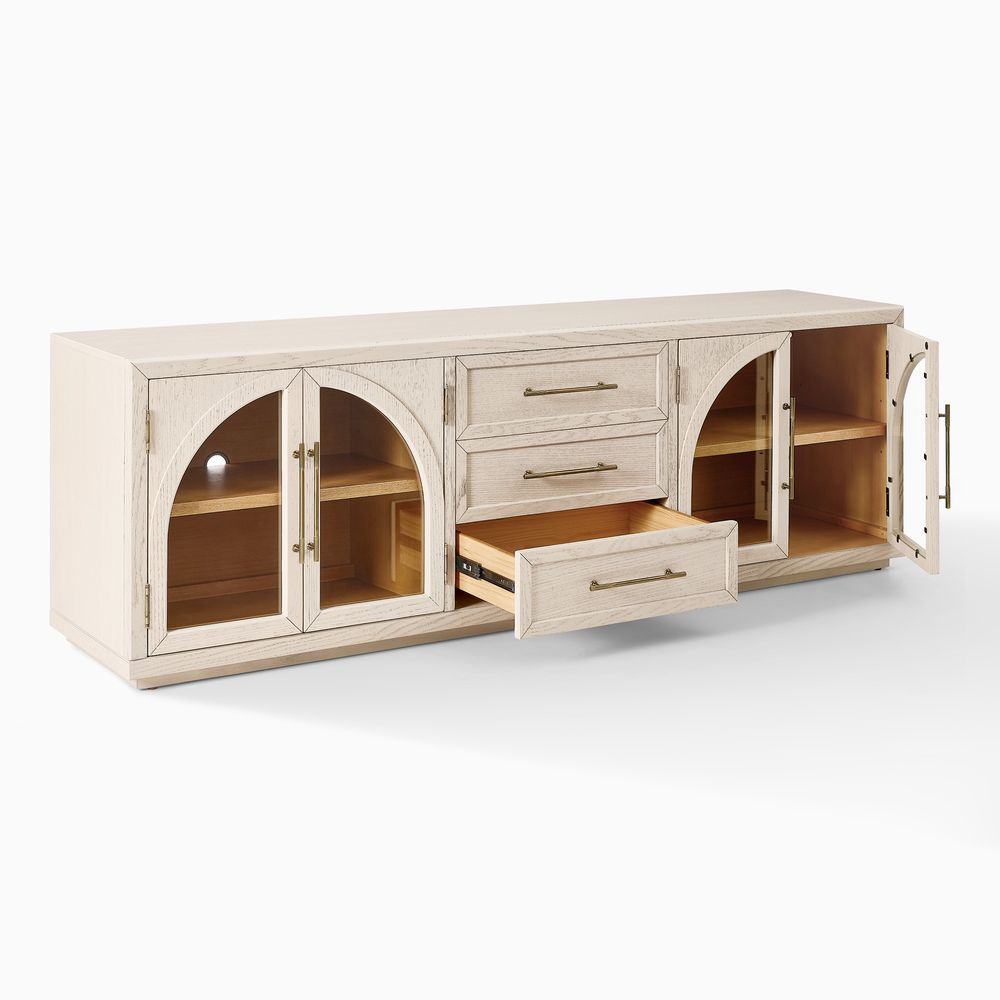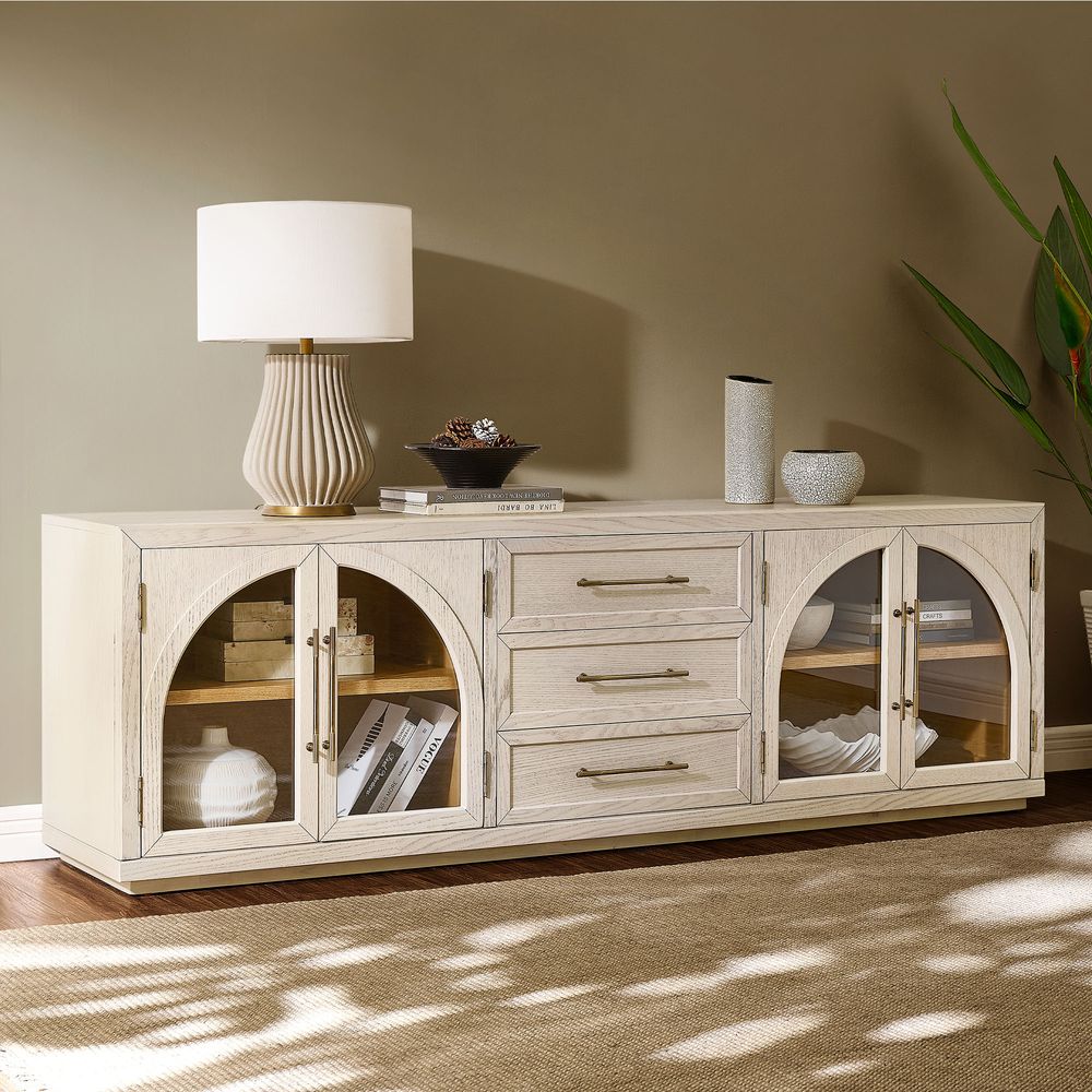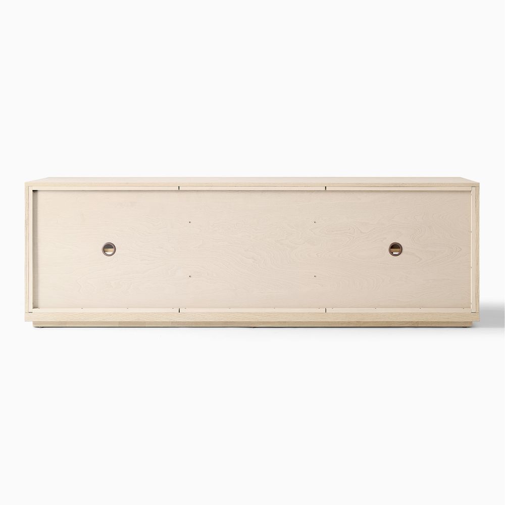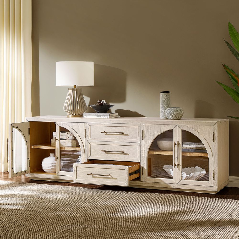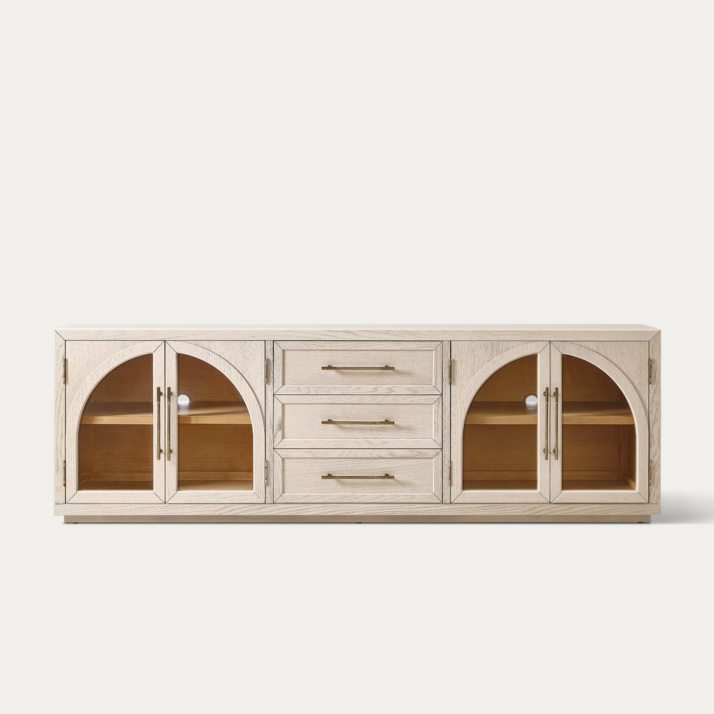 Crafted of American solid oak and engineered wood with oak veneers.All wood is kiln-dried for added durability.Finish is achieved through multistep process in which wood is wire brushed to highlight its rich grain.Drawers are crafted with precision dovetail joints for superior sturdiness and weight-bearing strength.Solid wood blocks are used at structural joints for reinforcement.Designed for TVs up to 85", 2 cord cutouts in back panel for cable management.Color perception may vary due to wood characteristics, lighting, and devices. Wood grain variation is expected, as each is unique.
