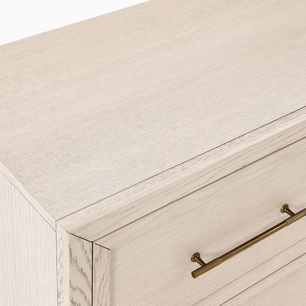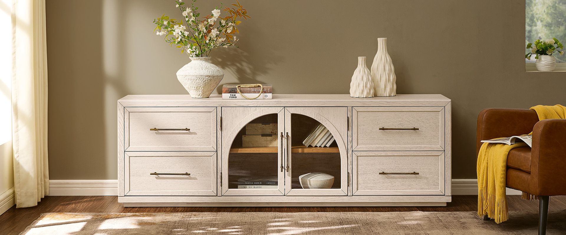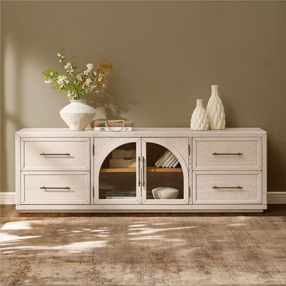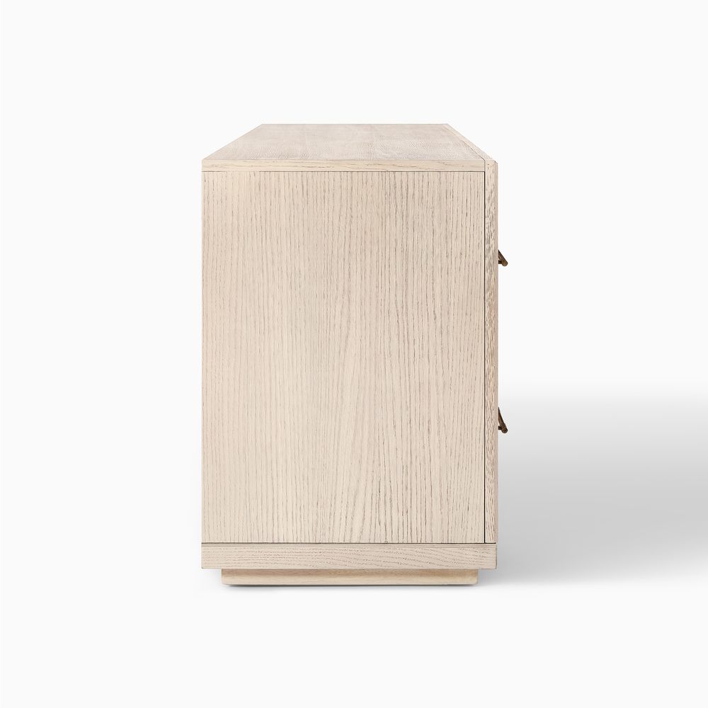 Crafted of American solid oak and engineered wood with oak veneers.All wood is kiln-dried for added durability.Finish is achieved through multistep process in which wood is wire brushed to highlight its rich grain.Drawers are crafted with precision dovetail joints for superior sturdiness and weight-bearing strength.Solid wood blocks are used at structural joints for reinforcement.Designed for TVs up to 85", 1 cord cutout in back panel for cable management.Color perception may vary due to wood characteristics, lighting, and devices. Wood grain variation is expected, as each is unique.
