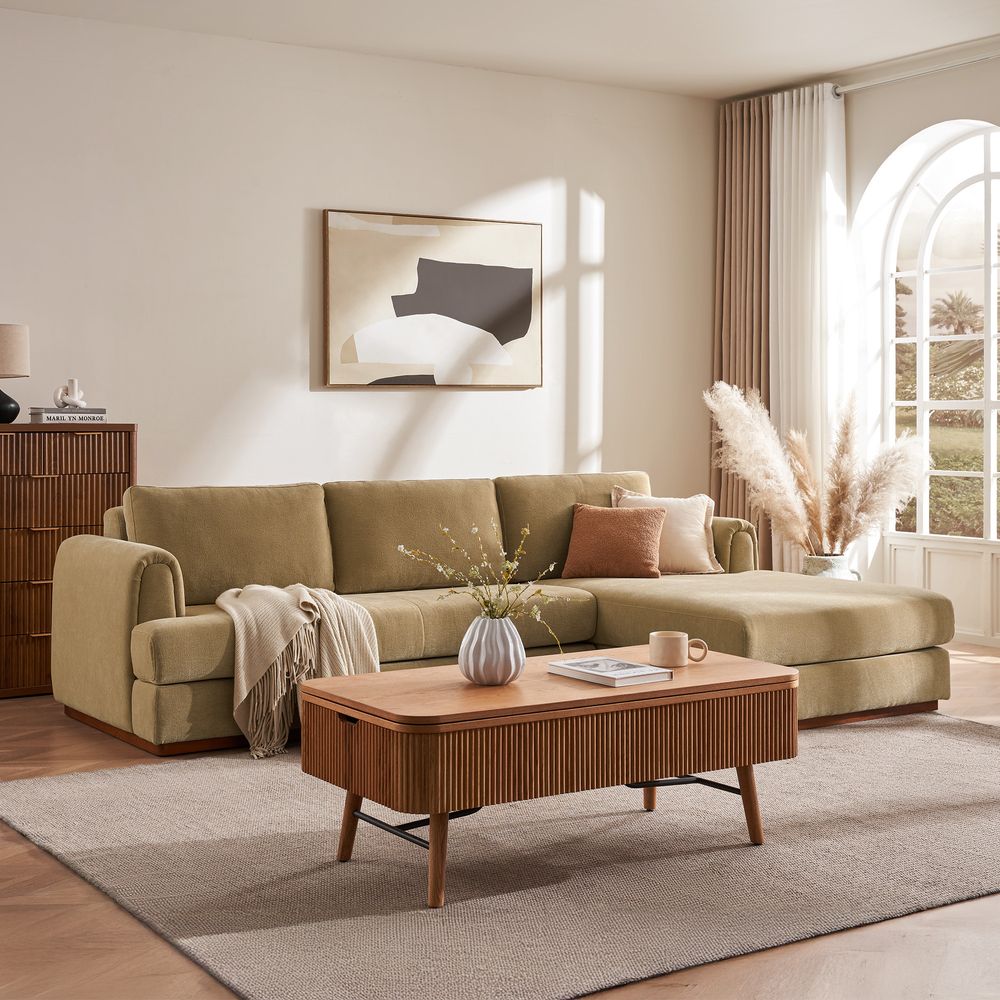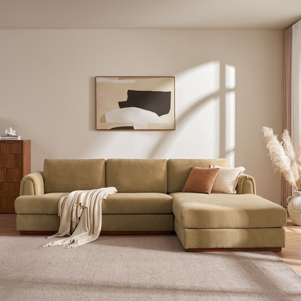 Preconfigured sofa consists of 1 two-seater left armchair and 1 right arm chaise.American solid ash wood and plywood frame.Chenille fabric with softness and a casual lived-in look.Seat cushions have fiber-wrapped, high-resiliency polyurethane foam cores.Sinuous spring suspension with reinforced elastic webbing.The upholstery on the sofa adds soft padding for cozy, stylish seating surfaces.Cushion covers unzip to remove.113" sofa designed for 4-5 people's gathering.Items purchased at different times may not match due to different dye lots, also color perception can vary by lighting and devices.