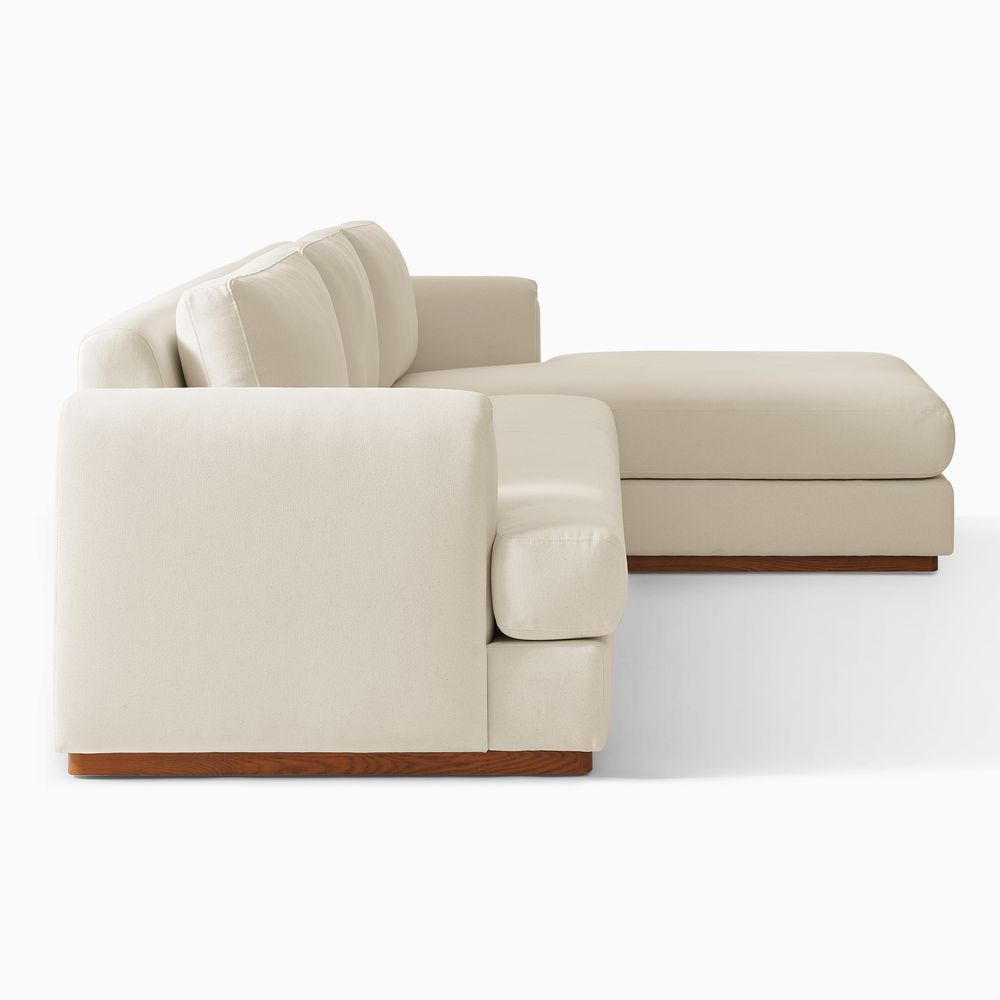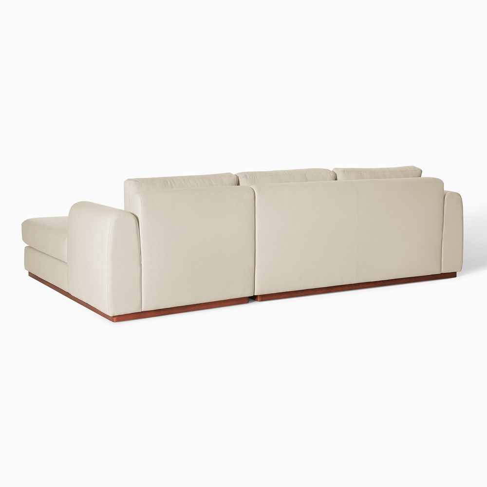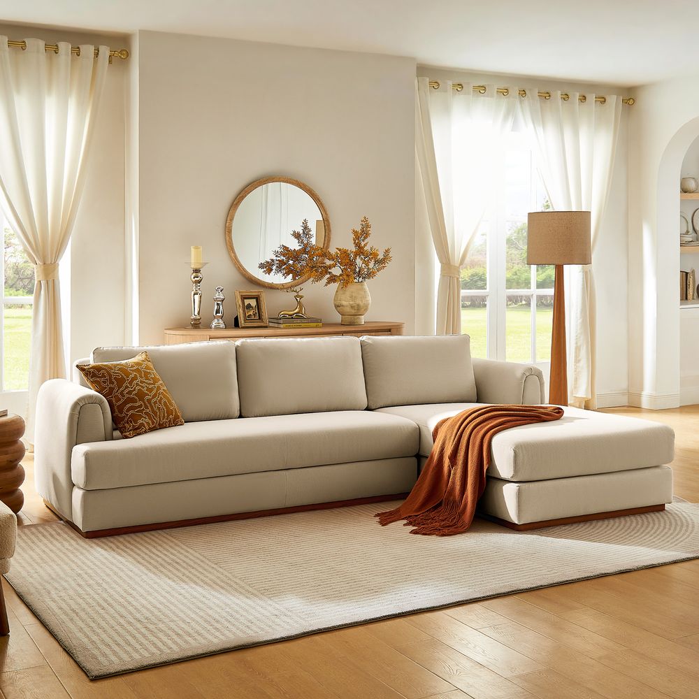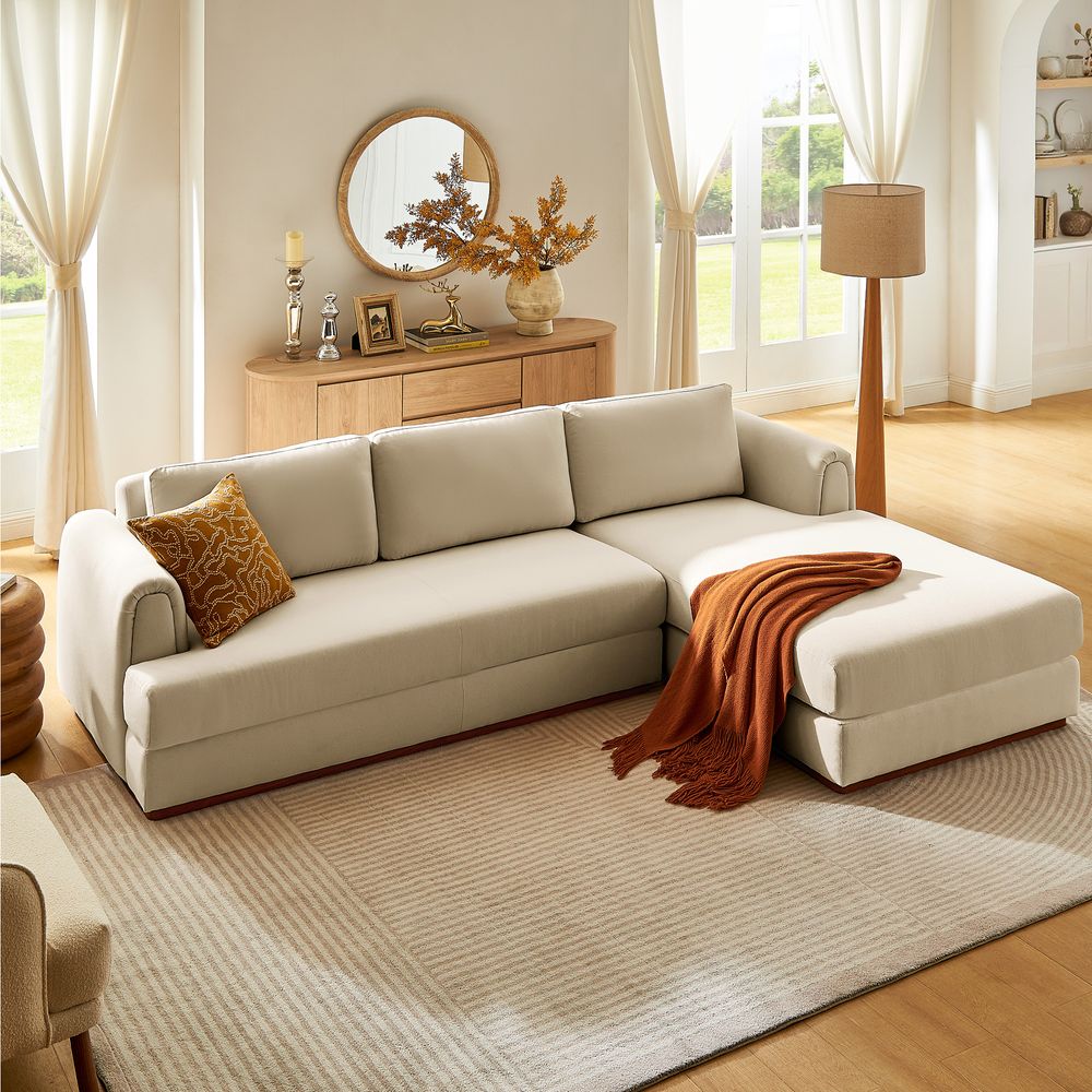 Preconfigured sofa consists of 1 two-seater left armchair and 1 right arm chaise.American solid ash wood and plywood frame.Cotton fabric is breathable, soft, durable, and easy to care for.Foam, fiber and pocket spring filled seat; foam and fiber filled back.Sinuous spring suspension with reinforced elastic webbing.The upholstery on the sofa adds soft padding for cozy, stylish seating surfaces.Cushion covers unzip to remove, 2 throw pillows are included.Included sectional connectors ensure that components are secured tightly together, lift upward to release.Items purchased at different times may not match due to different dye lots, also color perception can vary by lighting and devices.
