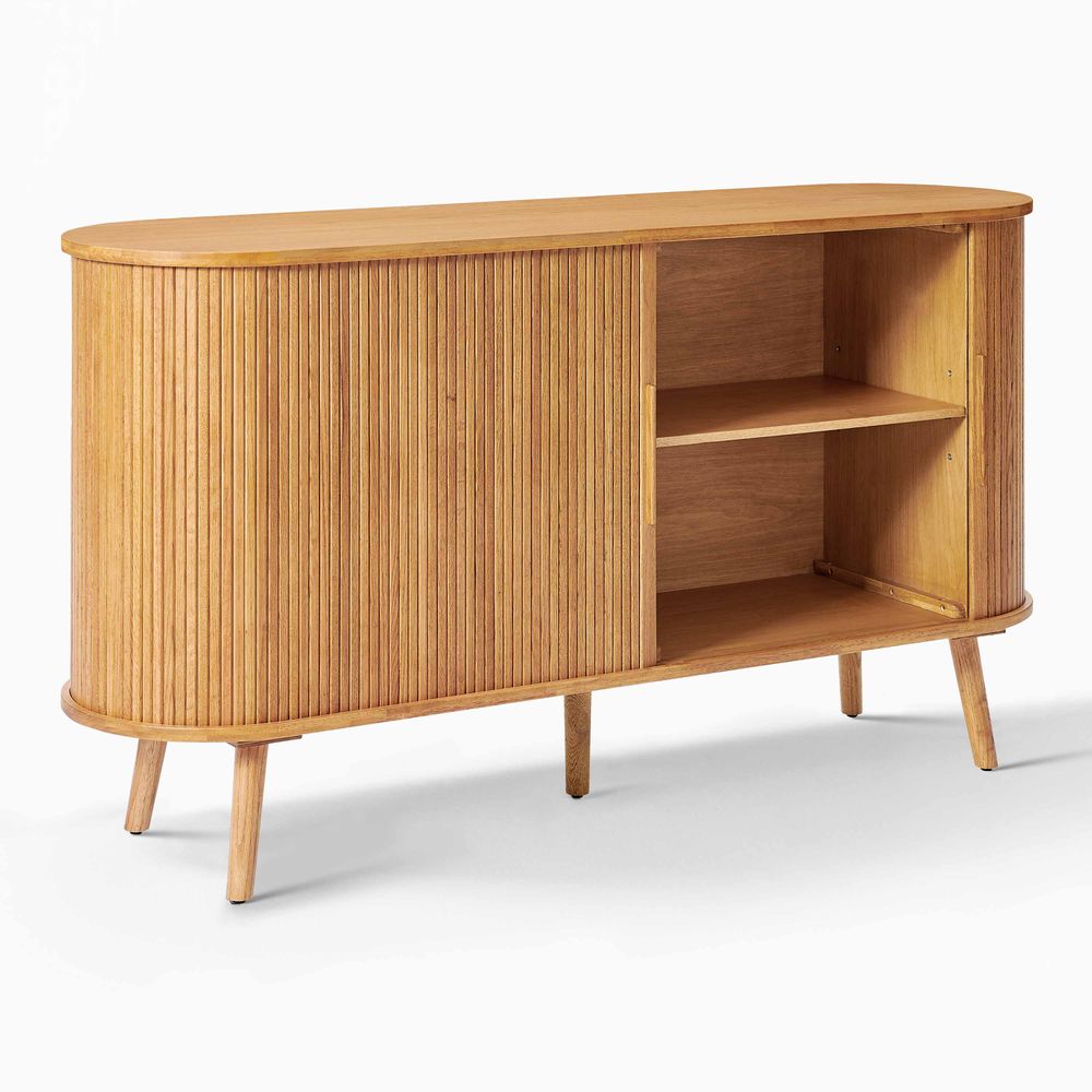 Designed in a mid-century aesthetic with sliding doors, this creation blends old-world elegance with functionality. The rich wood tones and textured surface recall mid-century design, offering a practical storage option that brings a touch of retro sophistication to modern interiors.