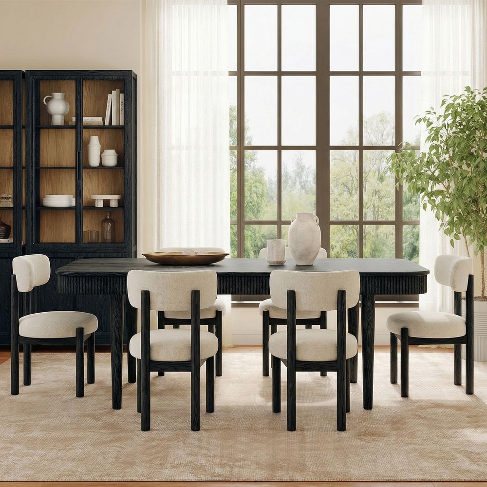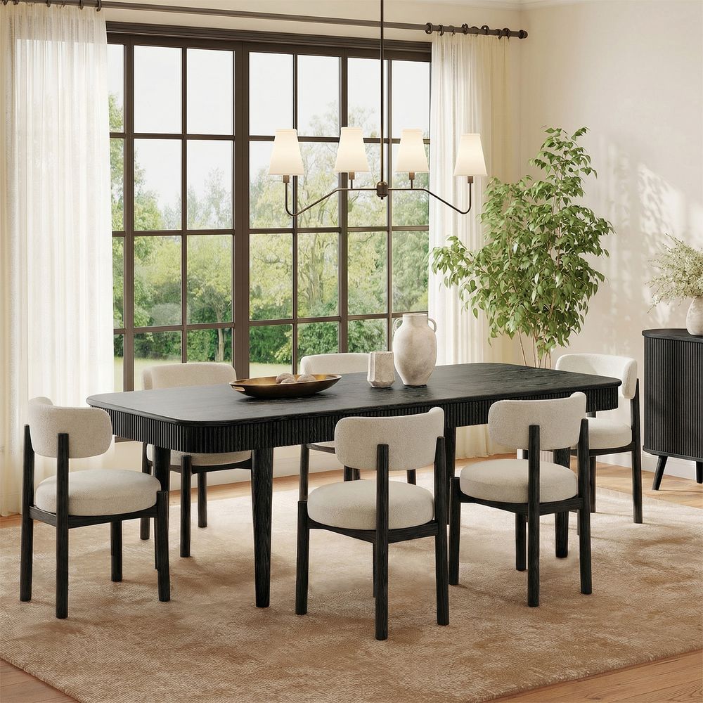 Set consists of 1 Valo 72"-92" extendable dining table and 6 Camille dining chairs.Dining table crafted of American solid oak and plywood with oak veneers.Dining chair frame crafted of American solid ash wood and plywood.Durable, tightly woven fabric with a rich texture and natural stain resistance.All wood is kiln-dried for added durability.Solid oak wood fluting presents a natural texture.Wood glazing adds visual interest with greater depth and layering and enhances coloring.The upholstery on the chair provides soft padding for a cozy and stylish seating surface.92" table comfortably seats 6-8.Chairs supporting up to 330 lbs.Color perception may vary due to wood characteristics, lighting, and devices. Wood grain variation is expected, as each is unique.Items purchased at different times may not match due to different dye lots, also color perception can vary by lighting and devices.