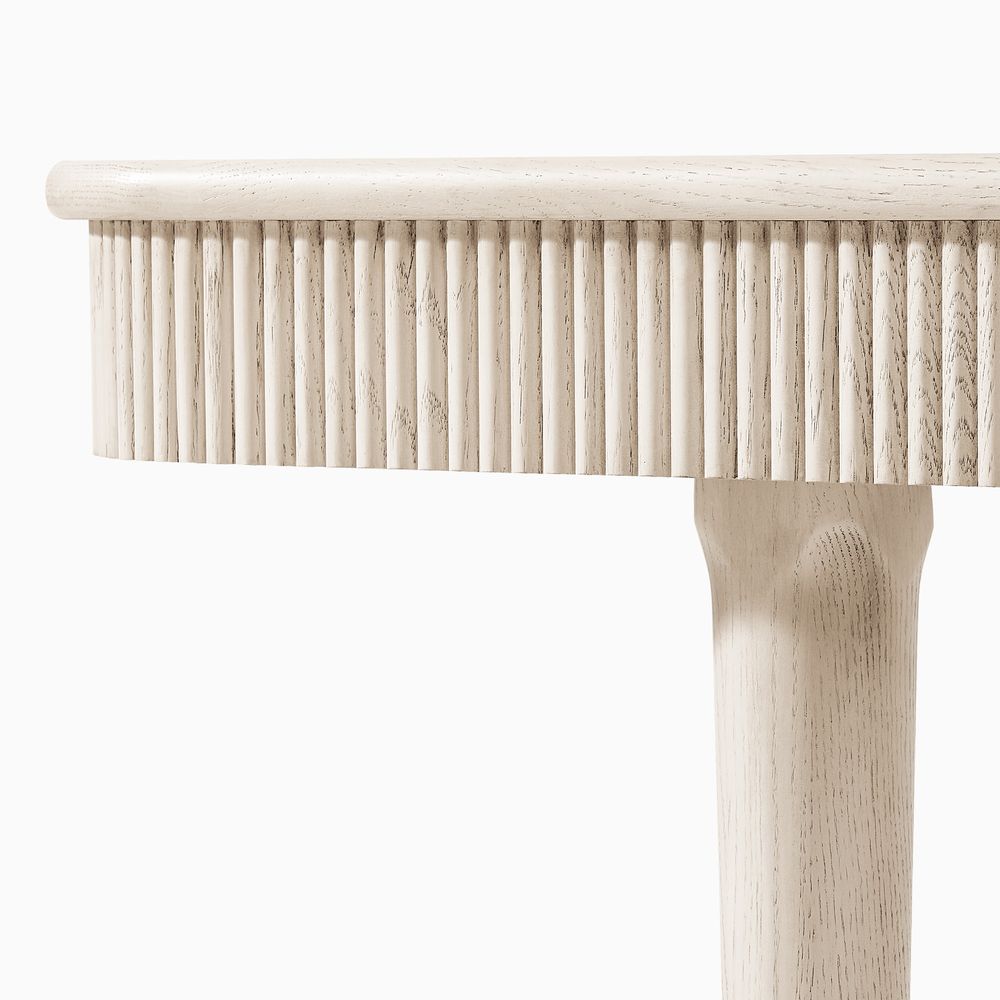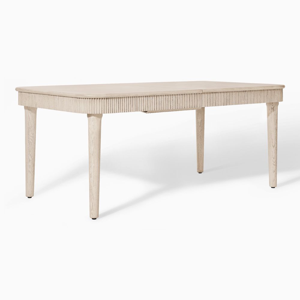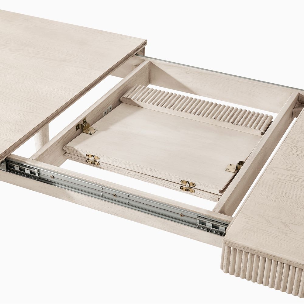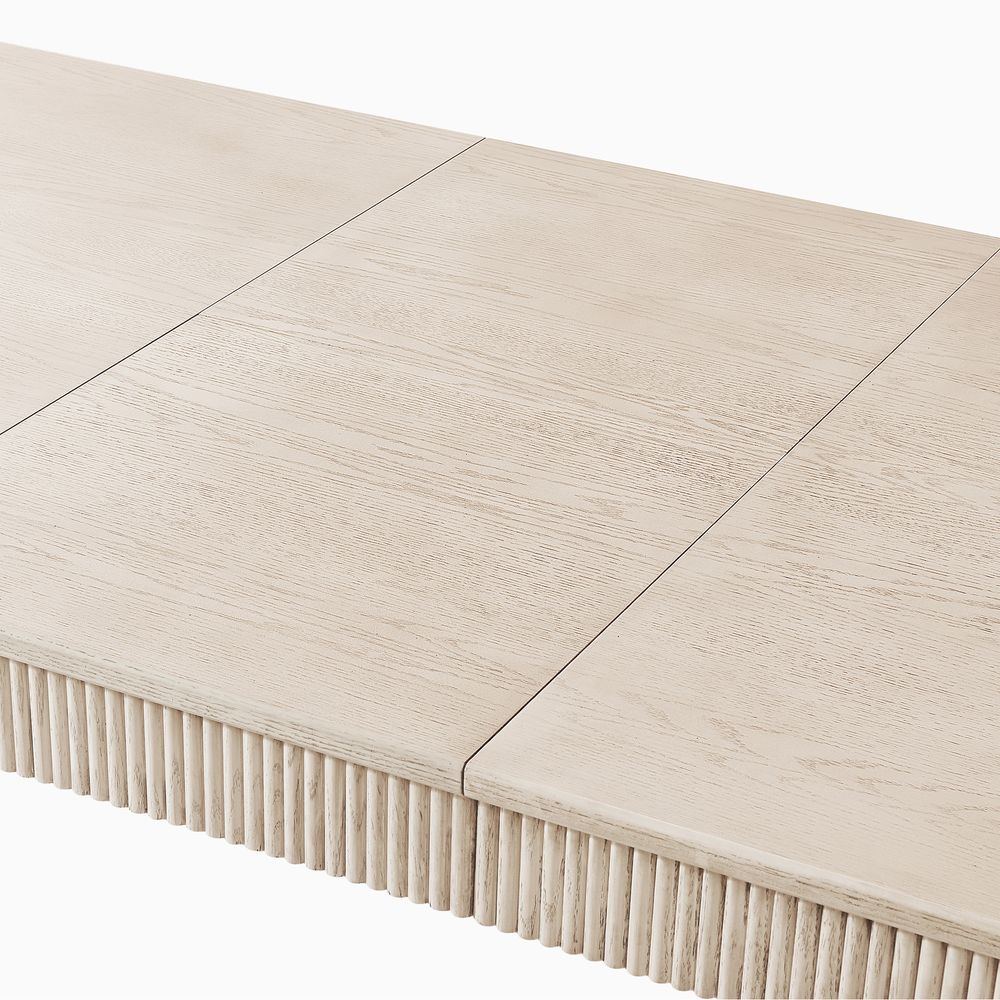 Crafted of American solid oak and plywood with oak veneers.All wood is kiln-dried for added durability.Finish is achieved through multistep process in which wood is wire brushed to highlight its rich grain.Wood glazing adds visual interest with greater depth and layering and enhances coloring.Solid oak fluting presents a natural texture.Extendable tabletop offers extra usable space on demand.92" table comfortably seats 6-8.Color perception may vary due to wood characteristics, lighting, and devices. Wood grain variation is expected; each is unique.
