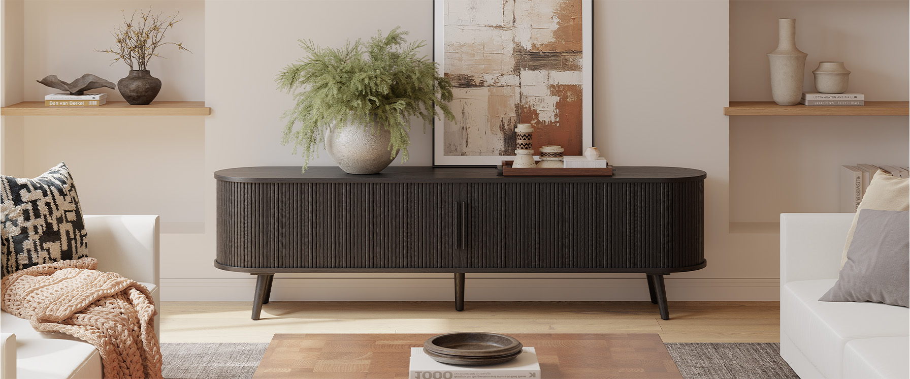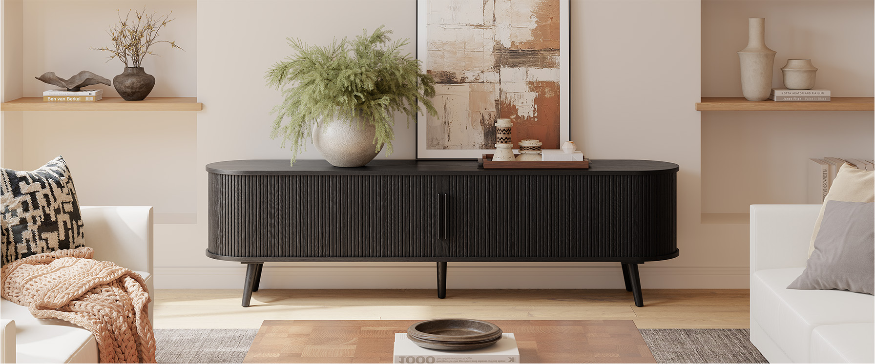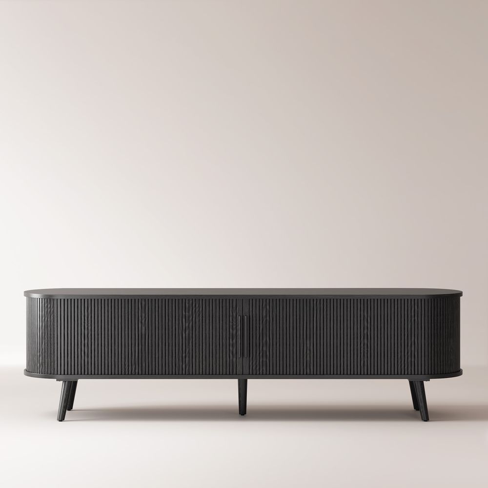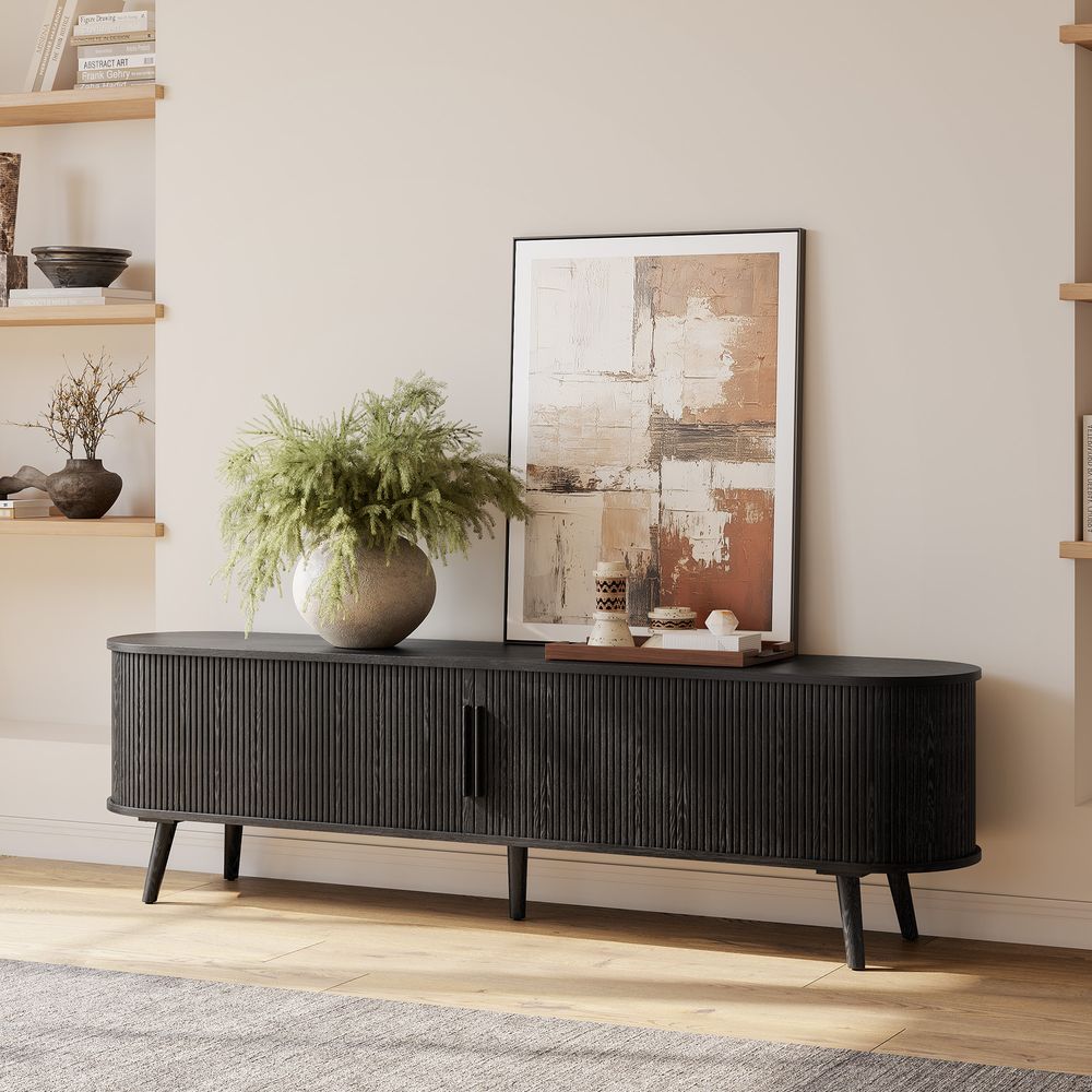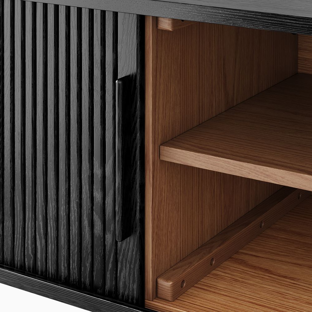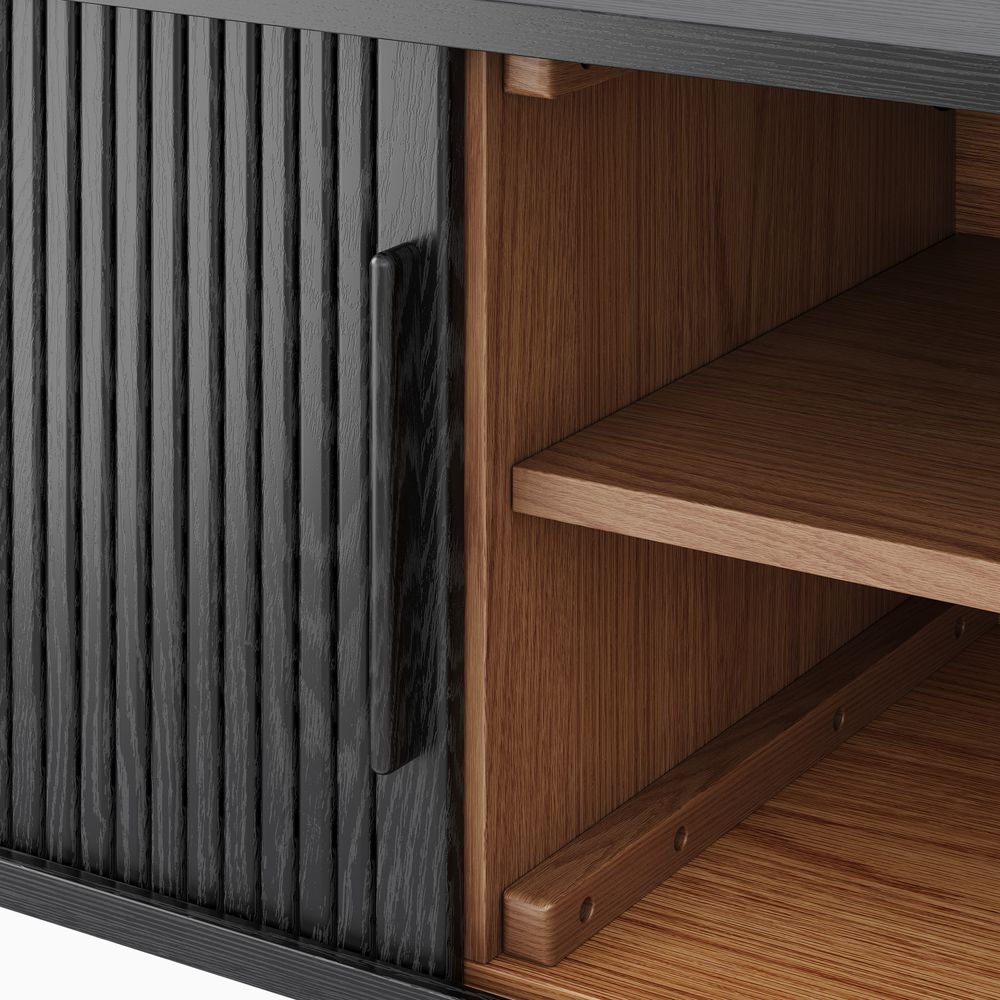 Crafted of American solid oak and engineered wood with oak veneers.All wood is kiln-dried for added durability.Solid wood blocks are used at structural joints for reinforcement.Solid oak fluting presents a natural texture.Tambour door offers a sleek, space-saving solution with a modern aesthetic.Designed for TVs up to 85", 2 cord cutouts in back panel for cable management.Color perception may vary due to wood characteristics, lighting, and devices. Wood grain variation is expected, as each is unique.