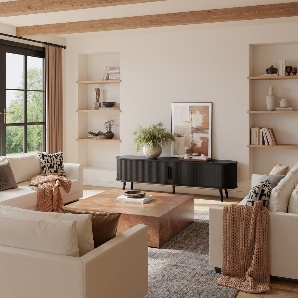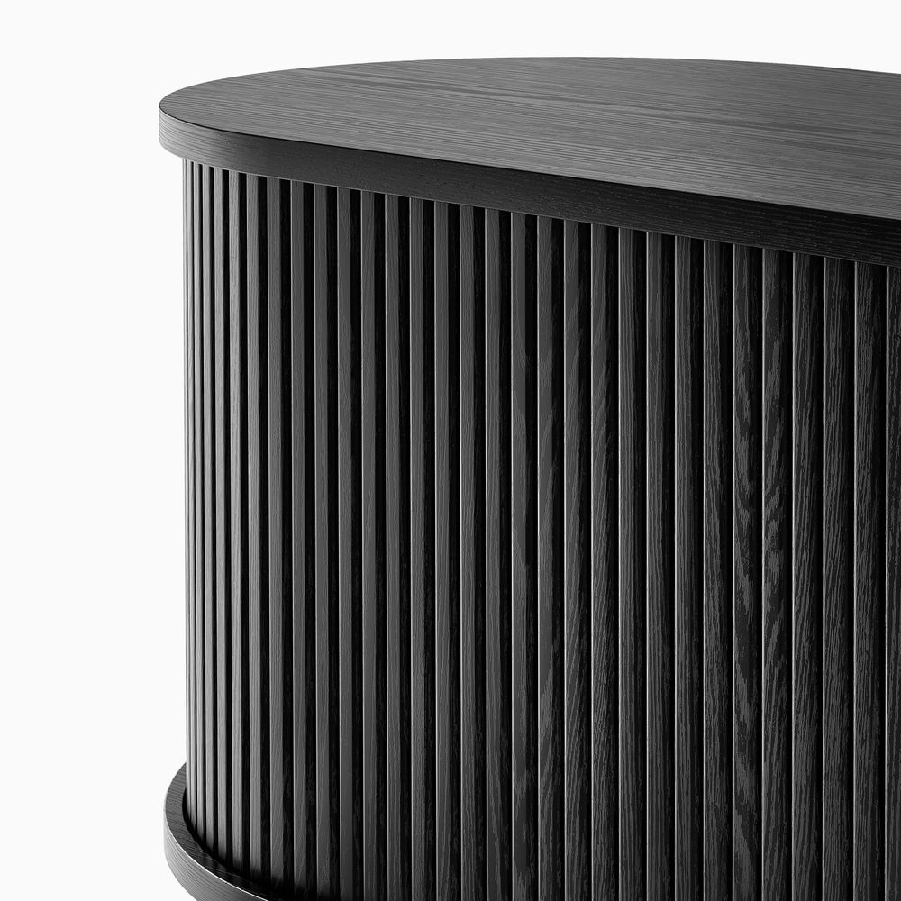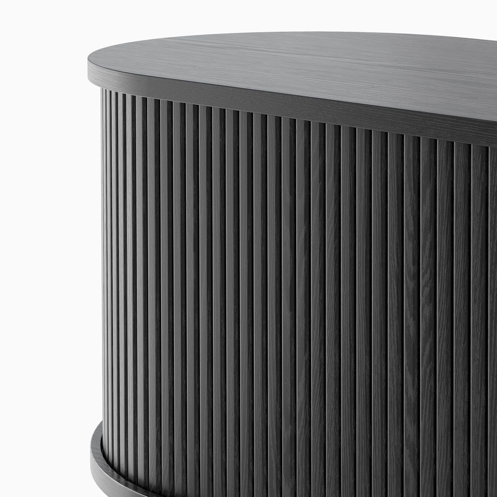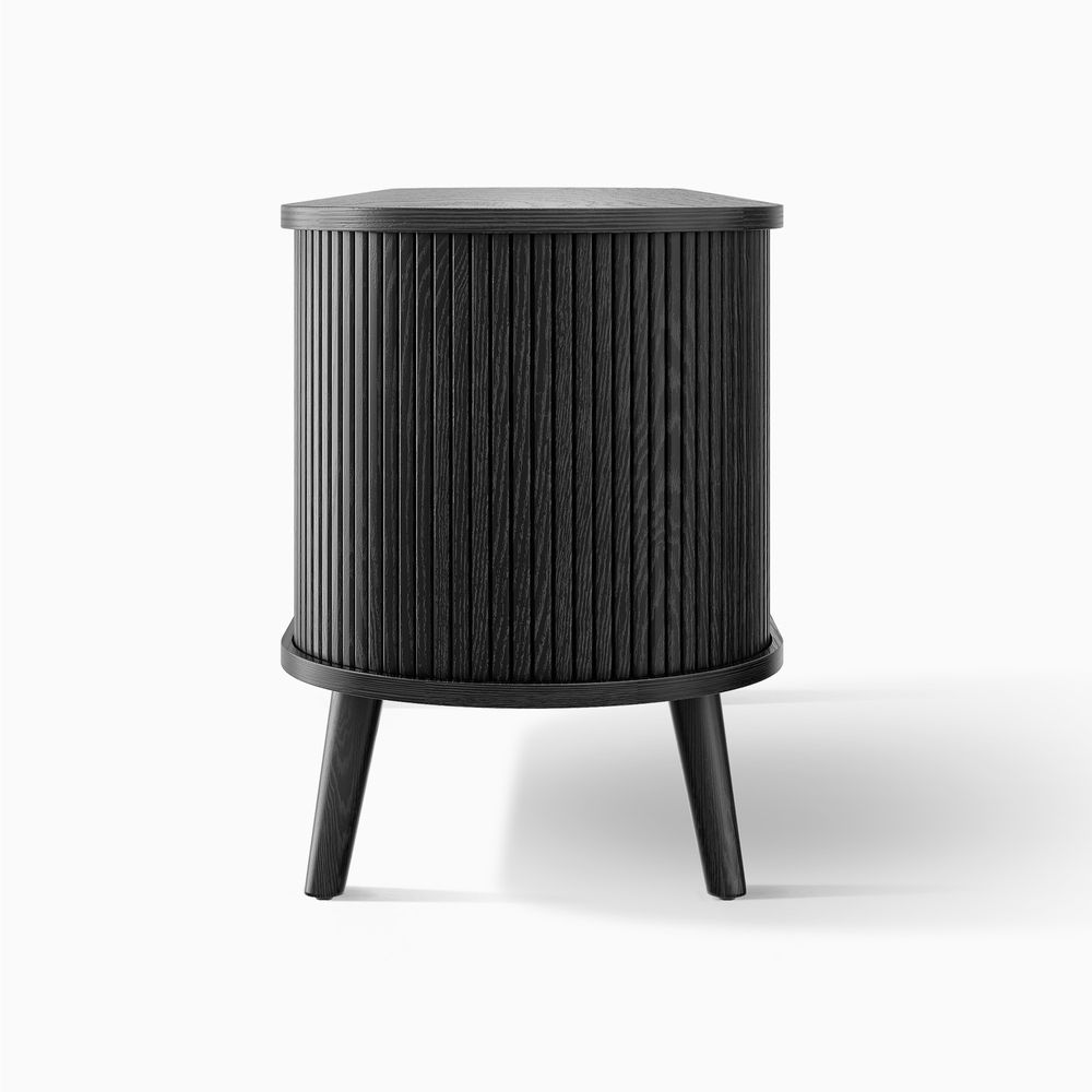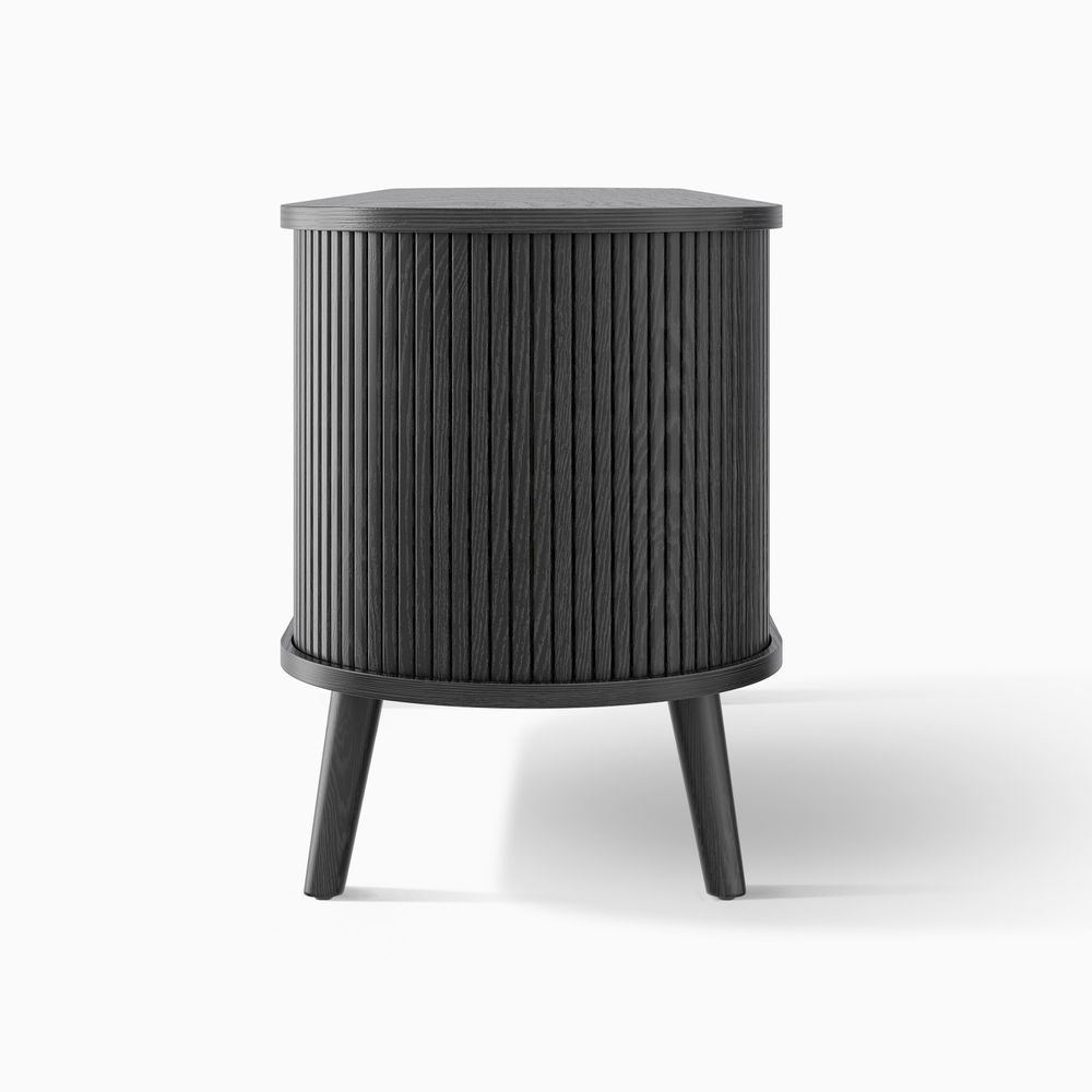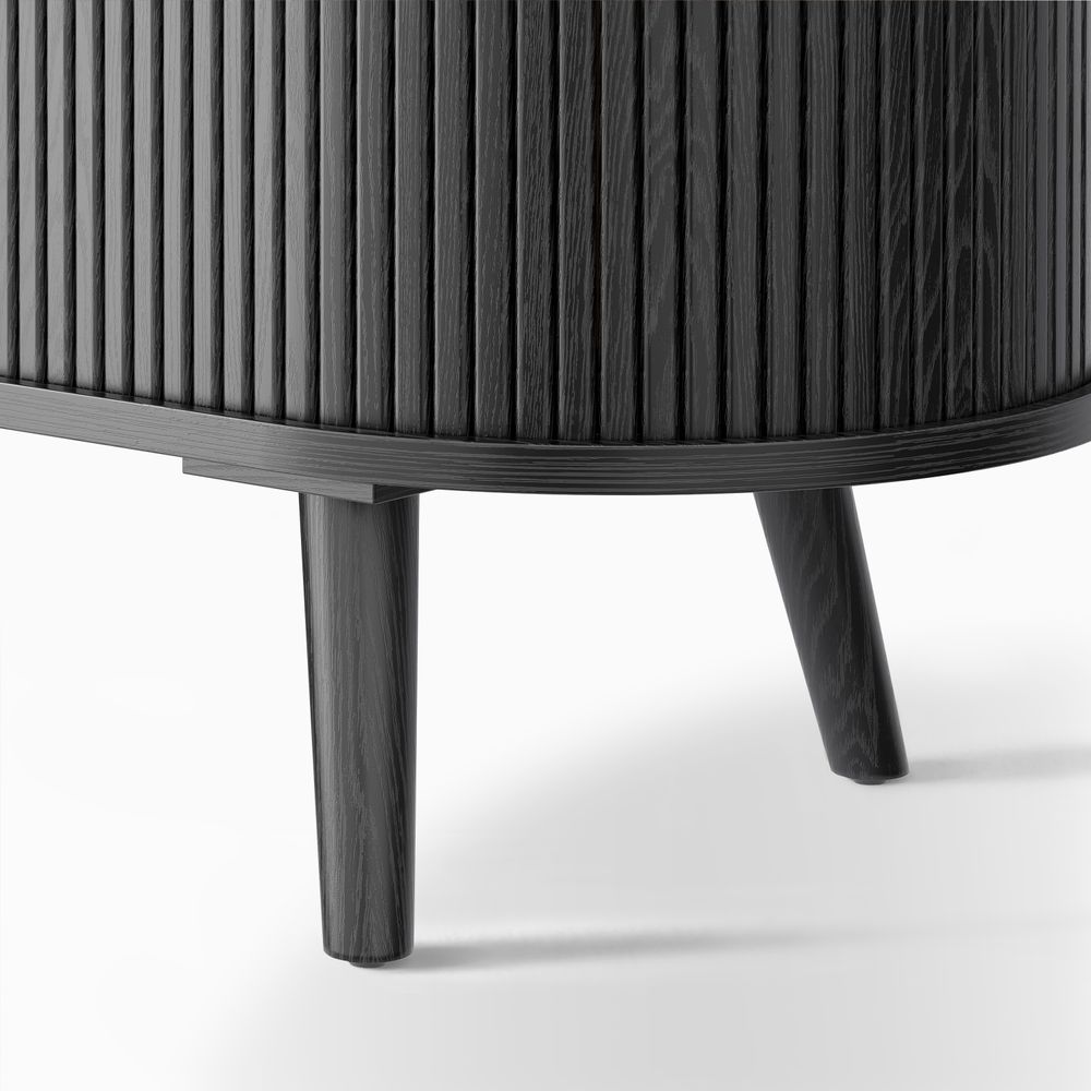 Crafted of American solid oak and engineered wood with oak veneers.All wood is kiln-dried for added durability.Solid wood blocks are used at structural joints for reinforcement.Solid oak fluting presents a natural texture.Tambour door offers a sleek, space-saving solution with a modern aesthetic.Designed for TVs up to 85", 2 cord cutouts in back panel for cable management.Color perception may vary due to wood characteristics, lighting, and devices. Wood grain variation is expected, as each is unique.