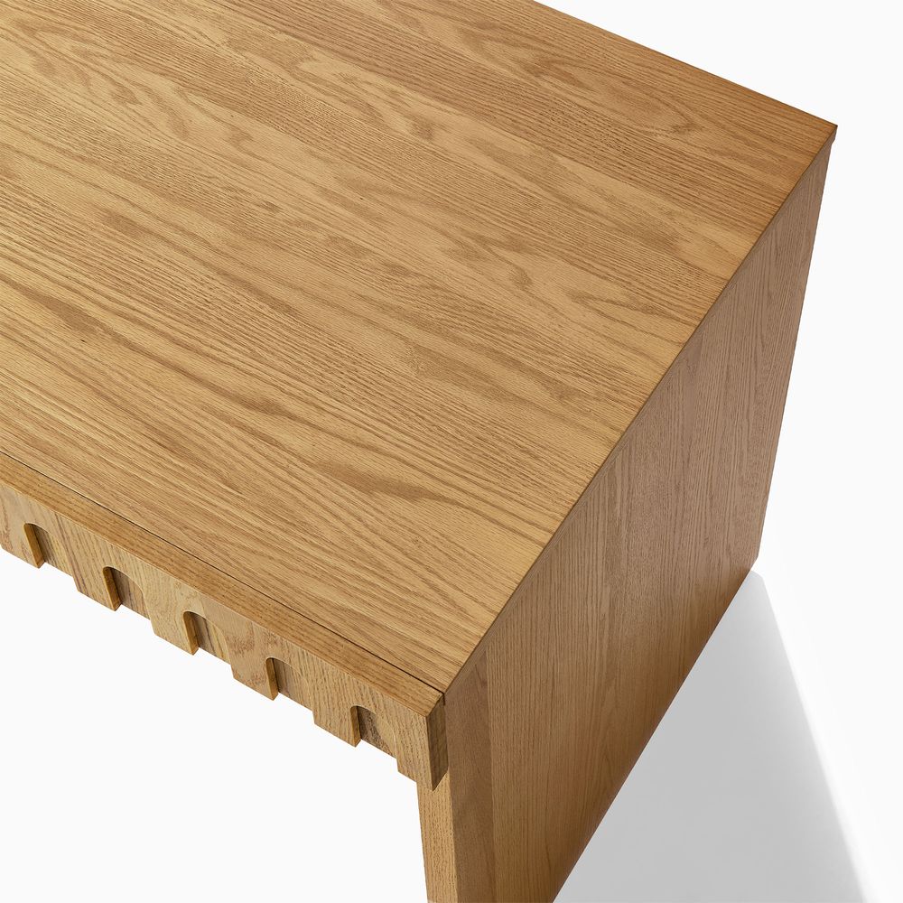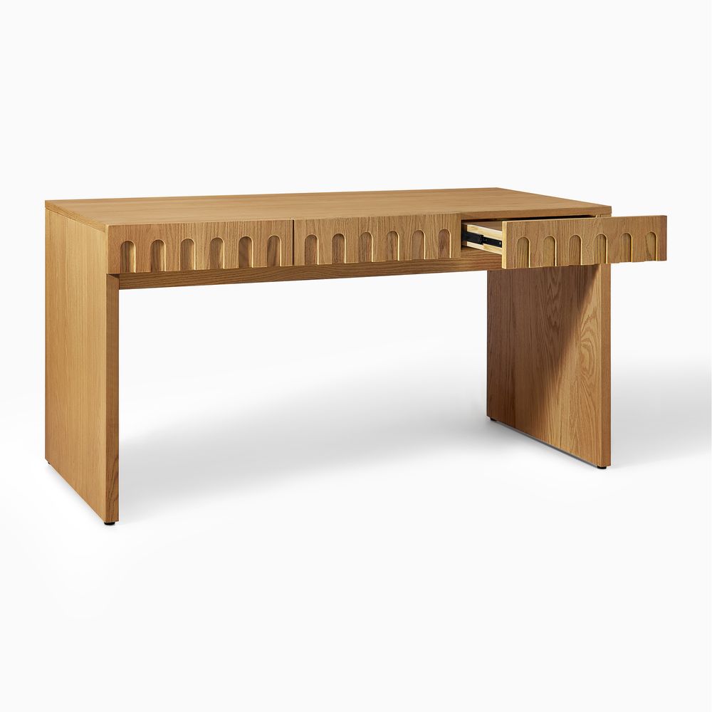 Inspired by timeless architectural forms, Vidar desk showcases a captivating facade adorned with elegant arched detailing. This distinctive design element infuses classic grandeur into a contemporary silhouette, creating a piece that's both a functional surface and a striking artistic statement.