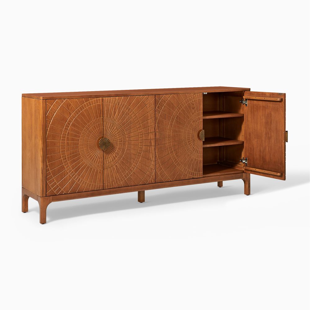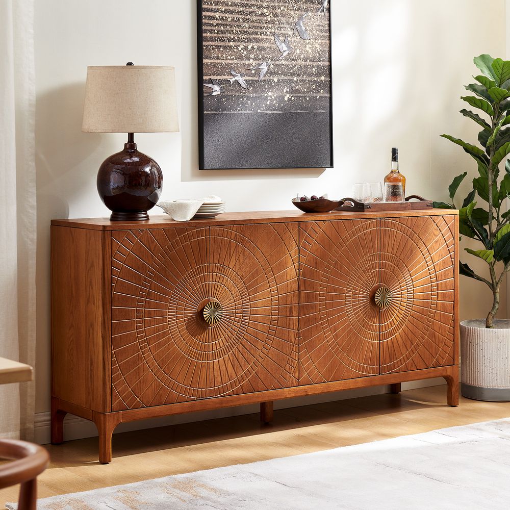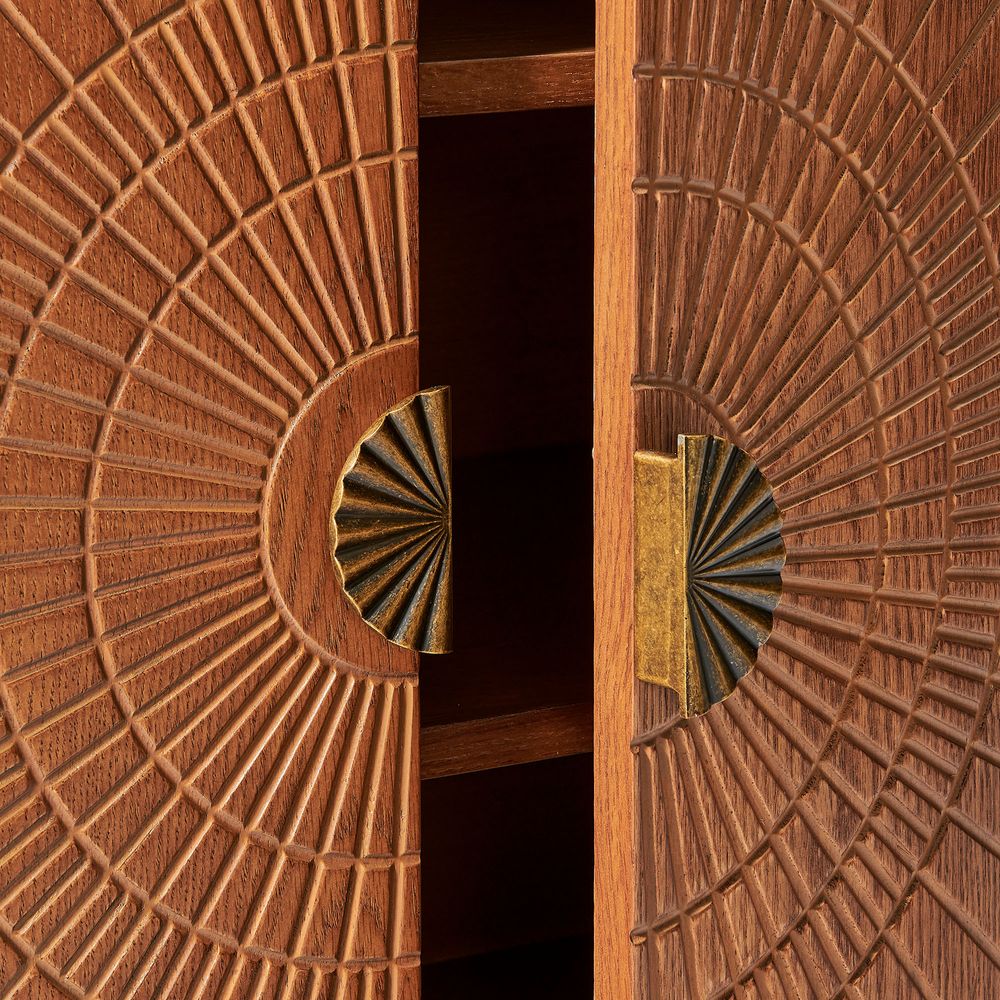 Drawing inspiration from mid-century modern design, the Vigdis collection is a celebration of natural materials and impeccable craftsmanship. Its most striking feature is the exquisite sunburst carving adorning the surface, adding an artistic touch and rich texture. This is complemented by elegantly tapered legs, which create a perfect balance between solid construction and a visually lightweight silhouette.