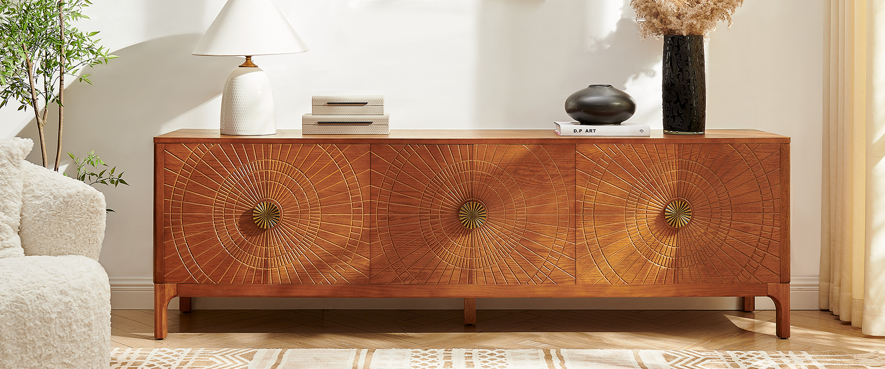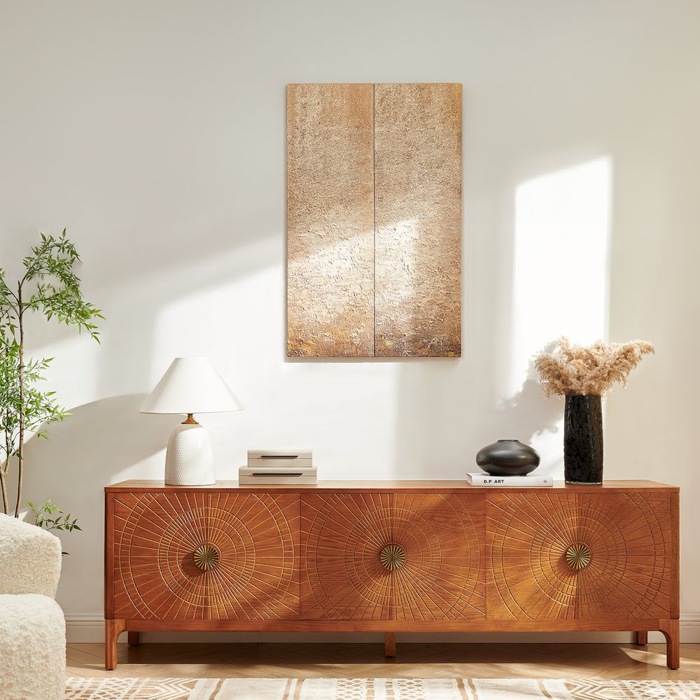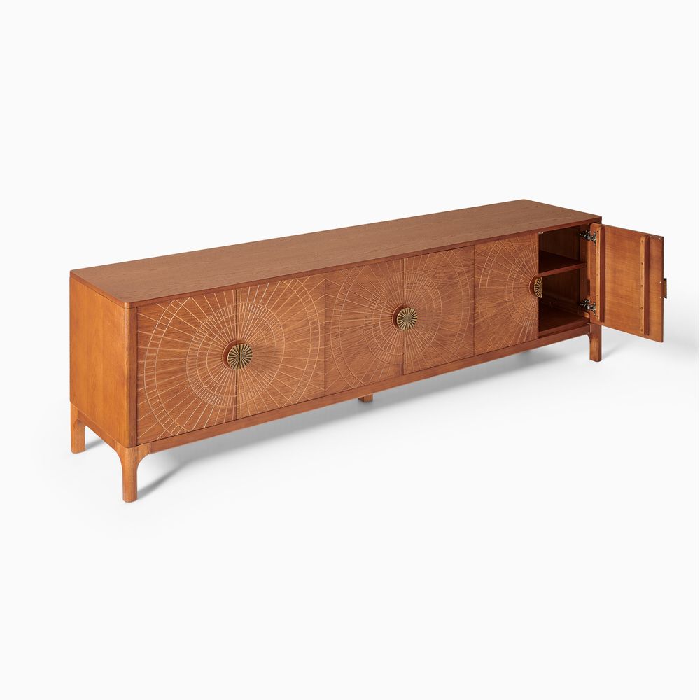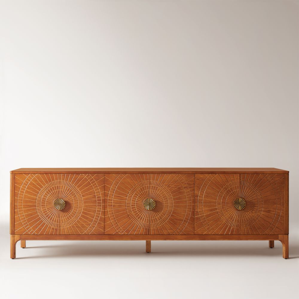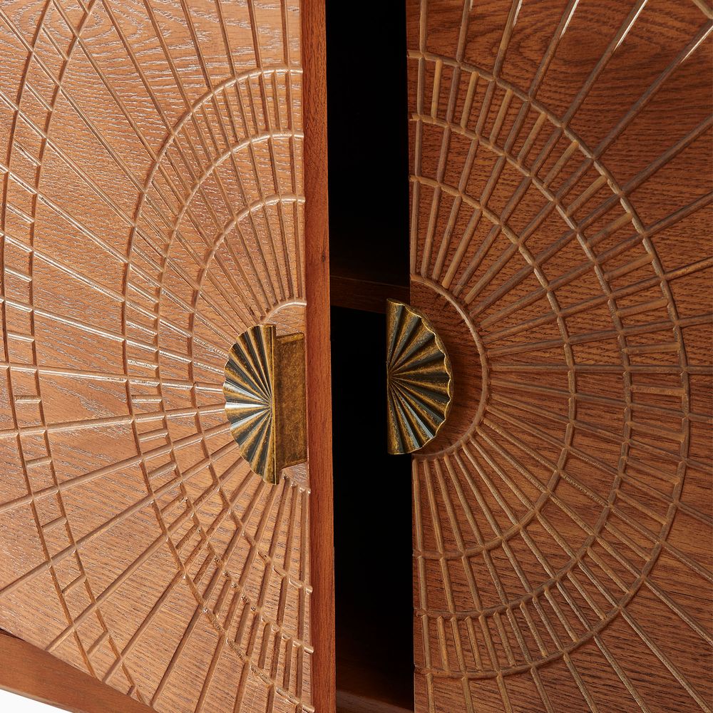 Drawing inspiration from mid-century modern design, the Vigdis collection is a celebration of natural materials and impeccable craftsmanship. Its most striking feature is the exquisite sunburst carving adorning the surface, adding an artistic touch and rich texture. This is complemented by elegantly tapered legs, which create a perfect balance between solid construction and a visually lightweight silhouette.