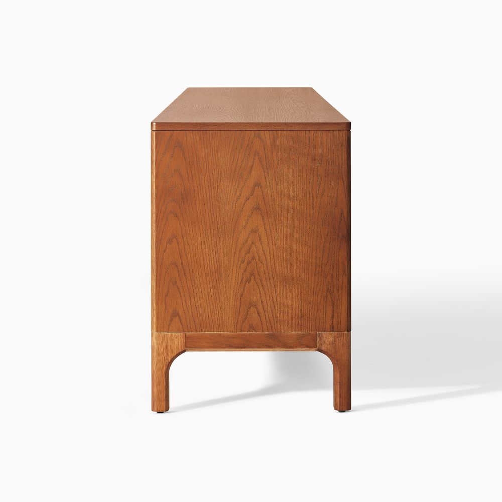 Crafted of American solid oak and plywood with oak veneers.All wood is kiln-dried for added durability.Finish is achieved through multistep process in which wood is wire brushed to highlight its rich grain.Wood glazing adds visual interest with greater depth and layering and enhances coloring.Solid wood blocks are used at structural joints for reinforcement.Designed for TVs up to 85", 6 cord cutouts in back panel for cable management.Color perception may vary due to wood characteristics, lighting, and devices. Wood grain variation is expected, as each is unique.
