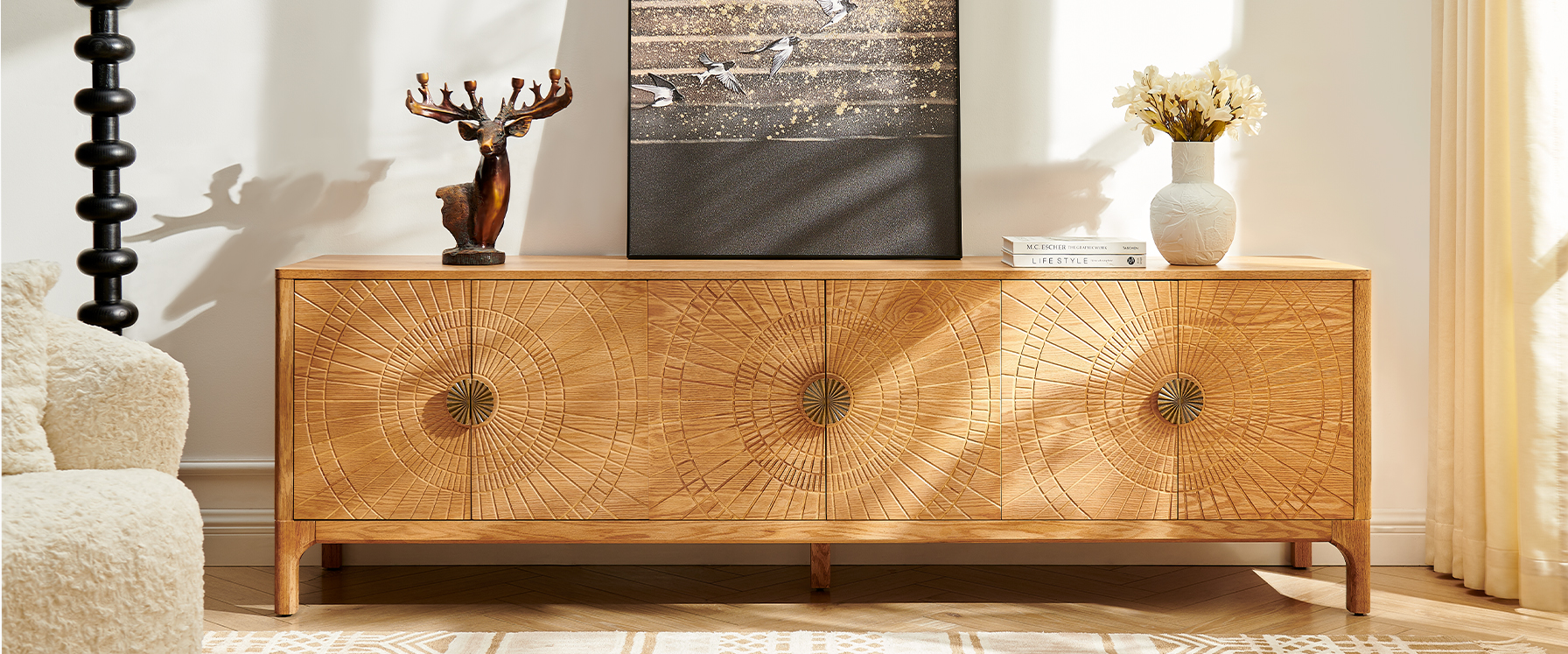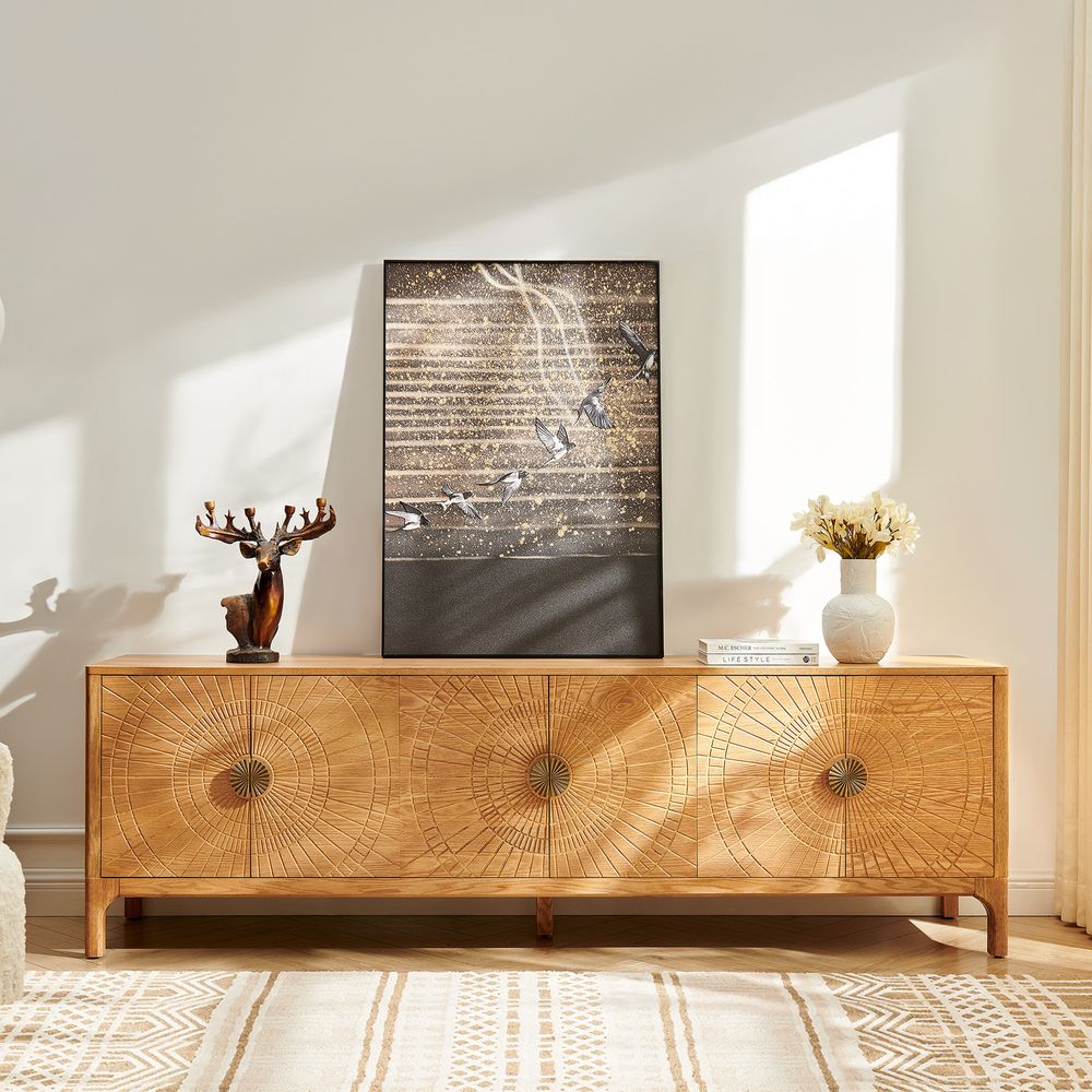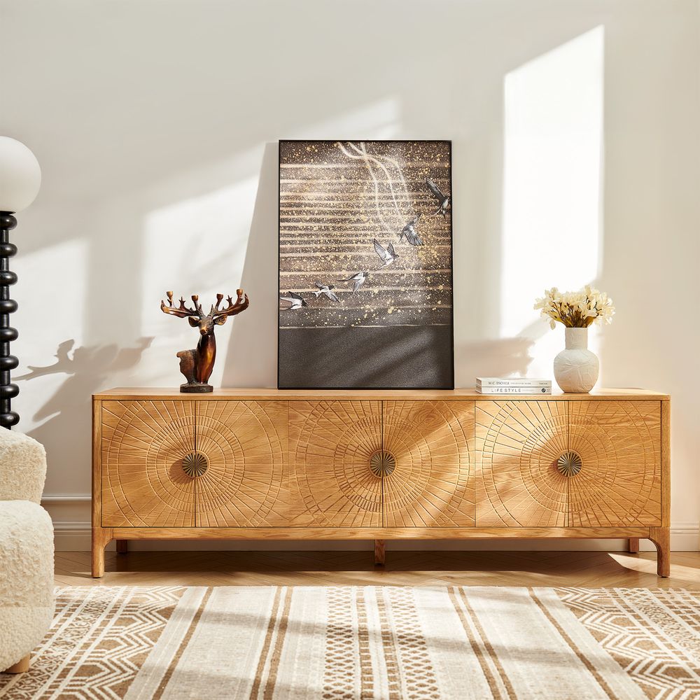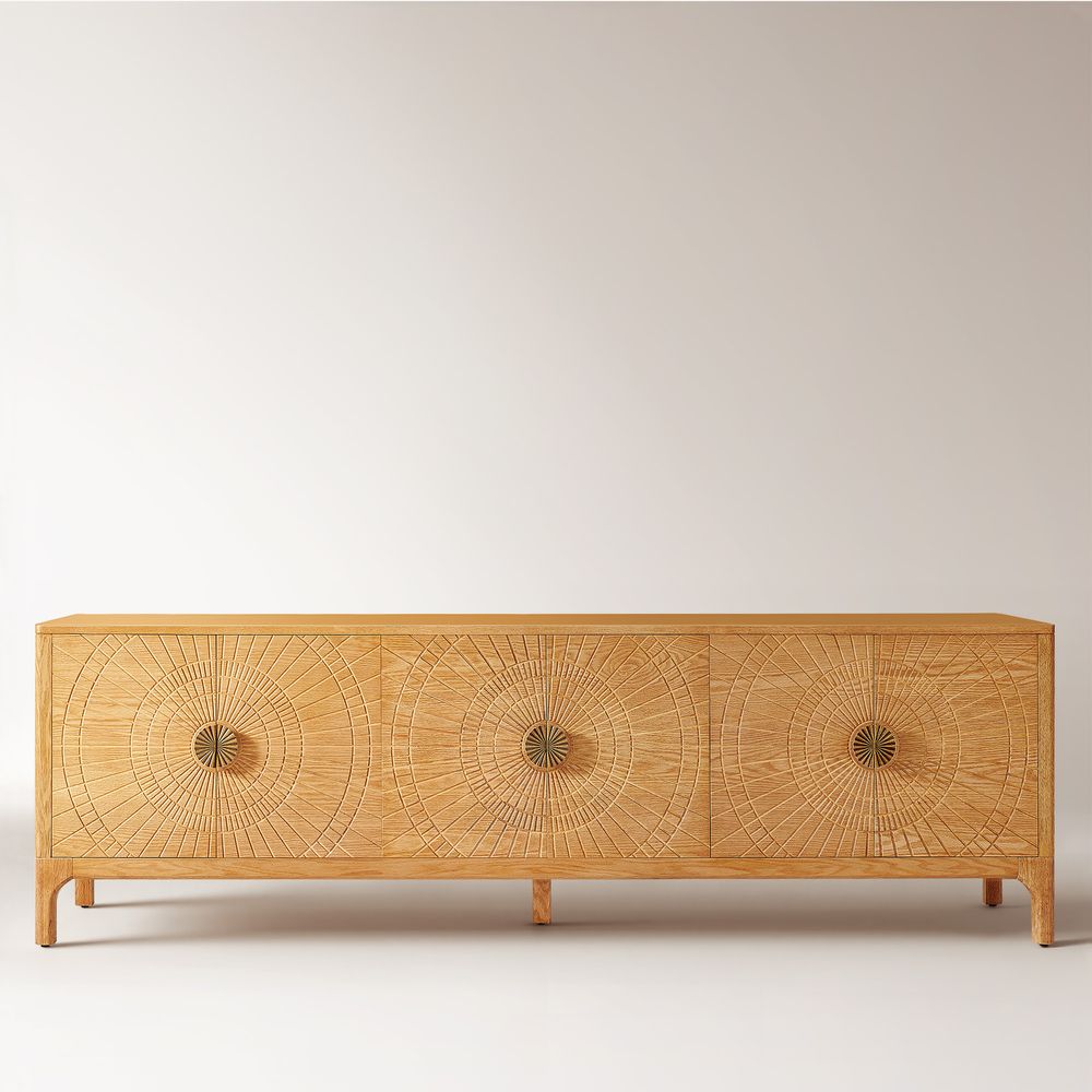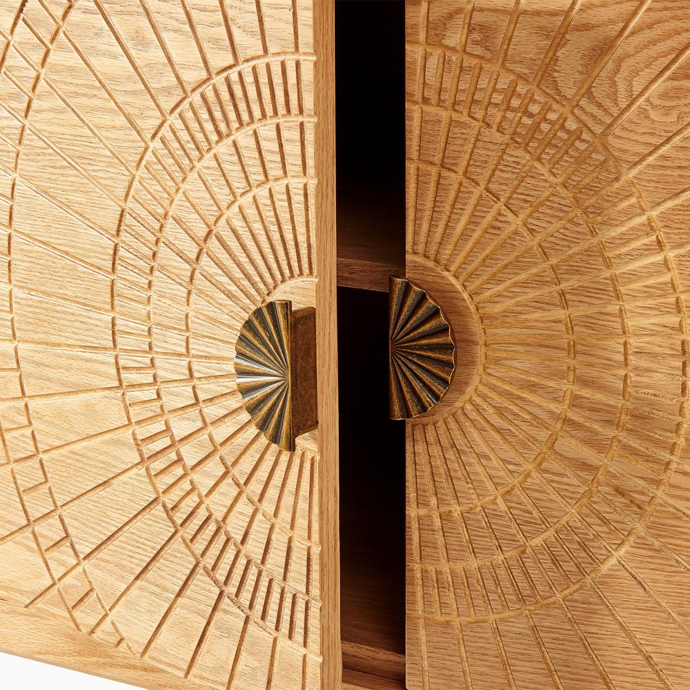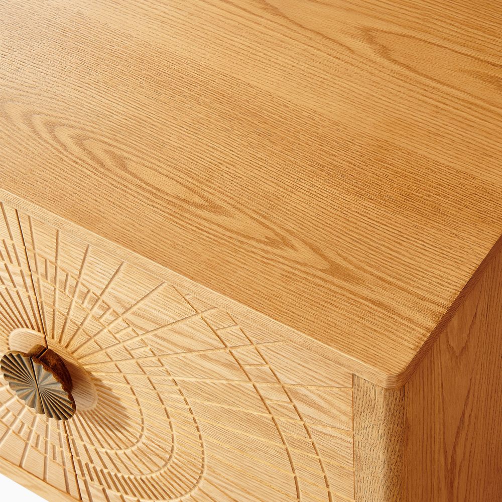 Drawing inspiration from mid-century modern design, the Vigdis collection is a celebration of natural materials and impeccable craftsmanship. Its most striking feature is the exquisite sunburst carving adorning the surface, adding an artistic touch and rich texture. This is complemented by elegantly tapered legs, which create a perfect balance between solid construction and a visually lightweight silhouette.