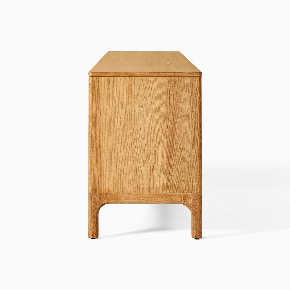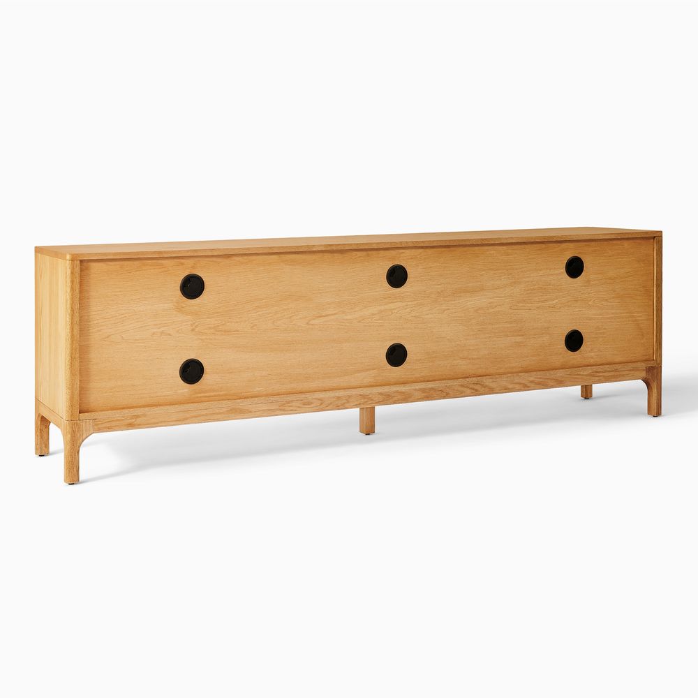 Crafted of American solid oak and plywood with oak veneers.All wood is kiln-dried for added durability.Finish is achieved through multistep process in which wood is wire brushed to highlight its rich grain.Wood glazing adds visual interest with greater depth and layering and enhances coloring.Solid wood blocks are used at structural joints for reinforcement.Designed for TVs up to 85", 6 cord cutouts in back panel for cable management.Color perception may vary due to wood characteristics, lighting, and devices. Wood grain variation is expected, as each is unique.